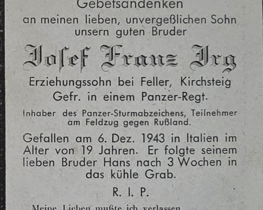 Sterbebild Gefreiter Miesbach 7. Komp. Panzer Regt. 26 PKA Villa Ruati Cassino Italien
