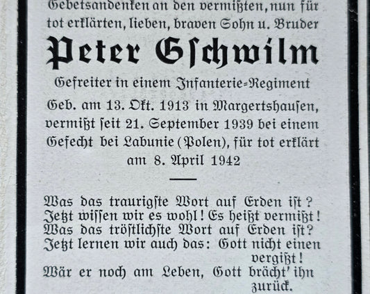 Sterbebild Gefreiter Edenhausen Inf. Regt. Vermisst Łabunie Polen 1939