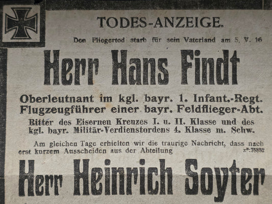 Todesanzeige Zeitung Sterbebild WK 1 Piloten Oberleutnant FFA 2 b Lille Frankreich Oberleutnant FA 300 'Pascha' Palästina El Cattia