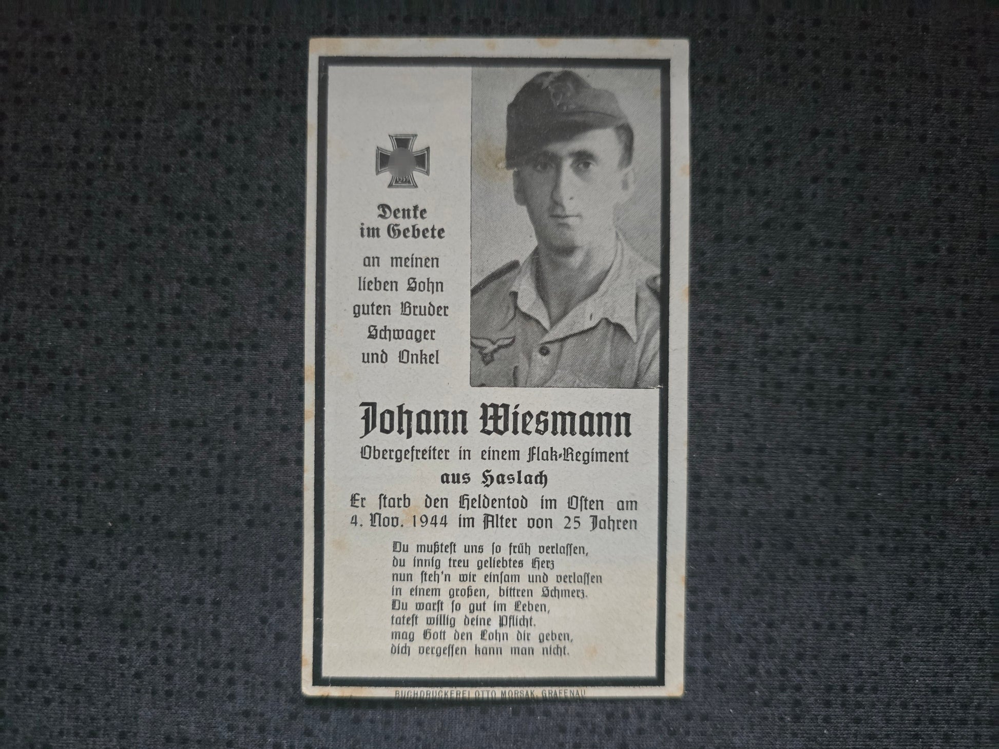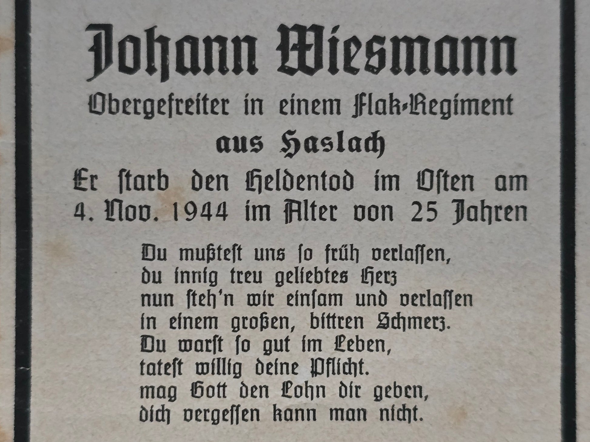 Sterbebild Obergefreiter Haslach 4. Flak Regt. 5 Gudwallen Ostpreußen