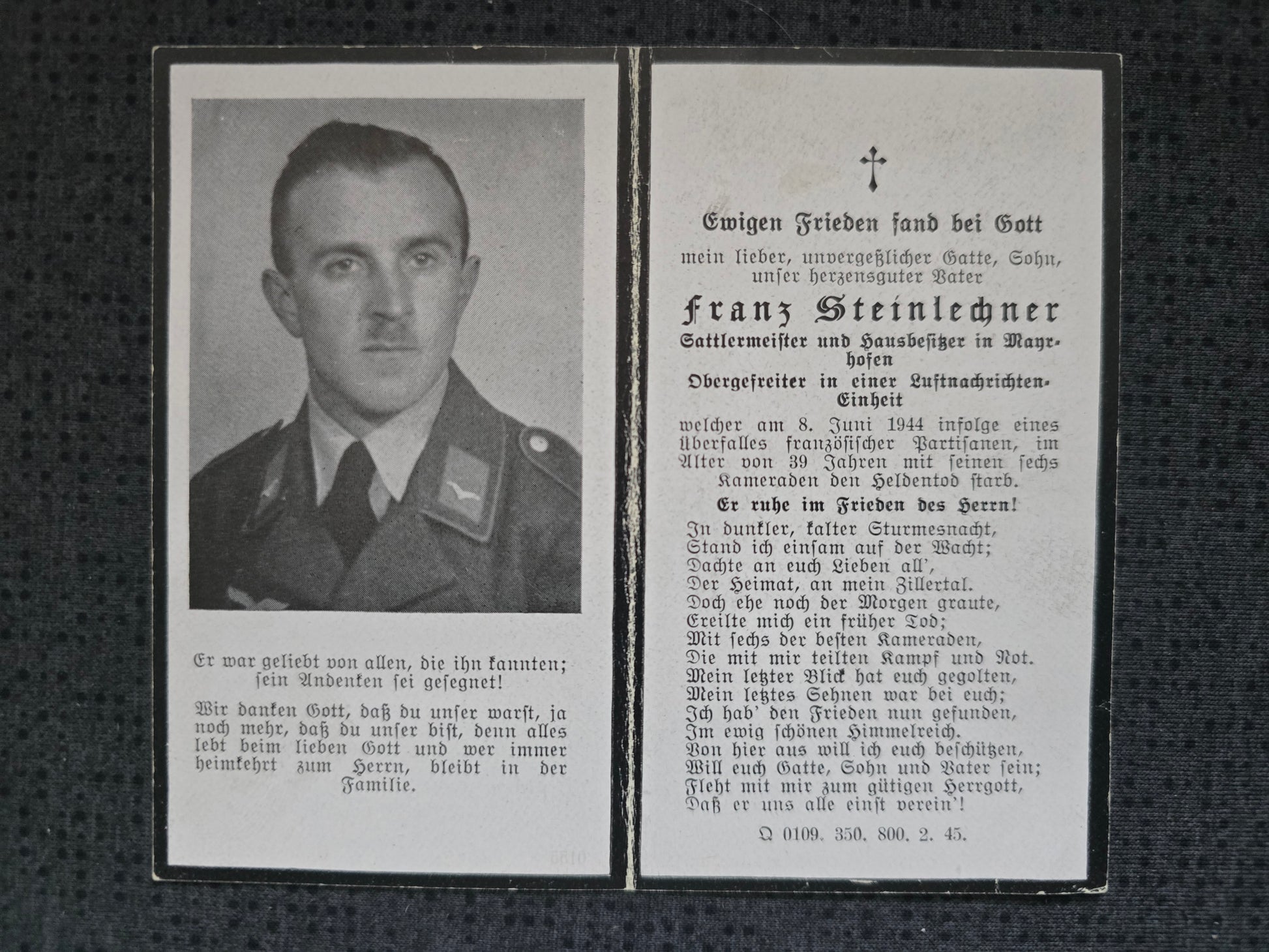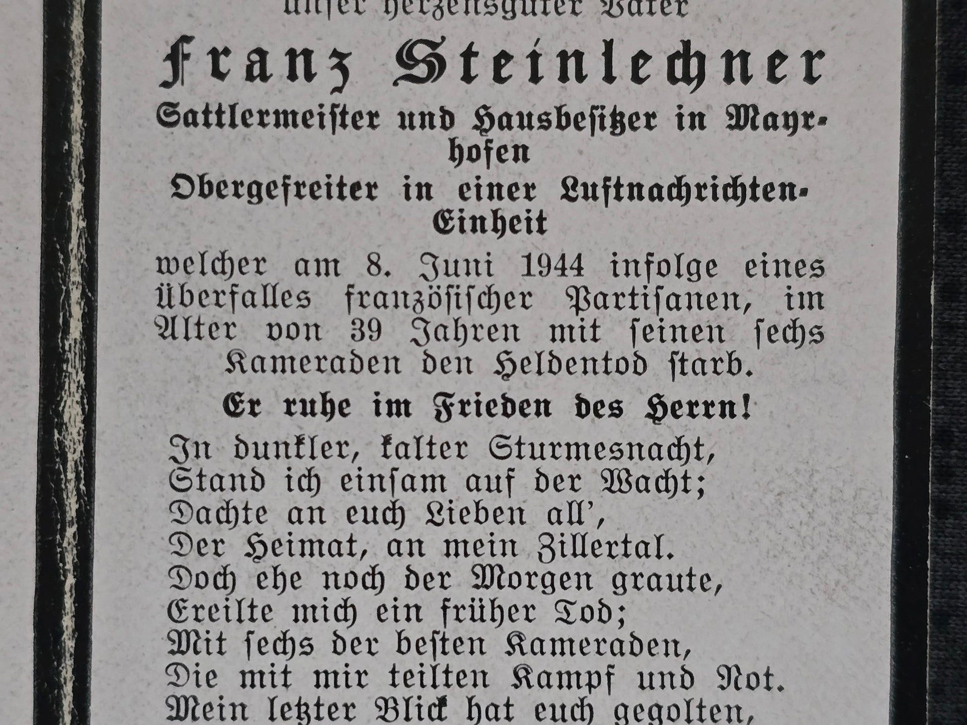 Sterbebild Obergefreiter Mayrhofen 22. Komp. LN Regt. Partisanen Résistance Les Ecorces Andilly Frankreich
