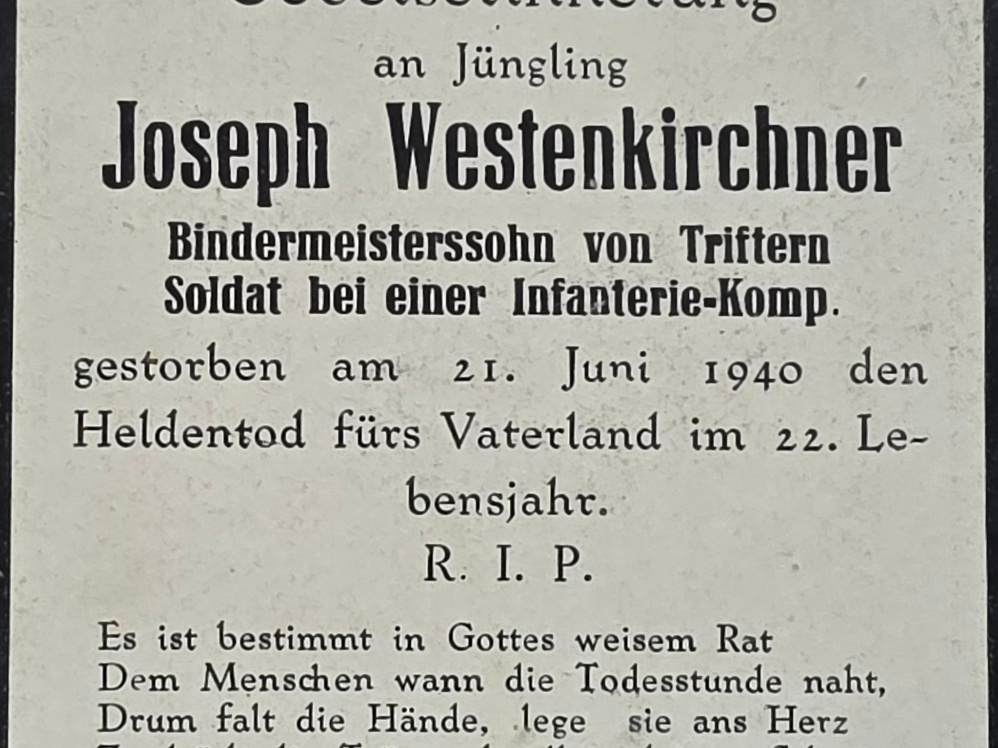 Sterbebild Schütze Triftern 11. Komp. Inf. Regt. 62 Scheldeübergang Tournai Belgien