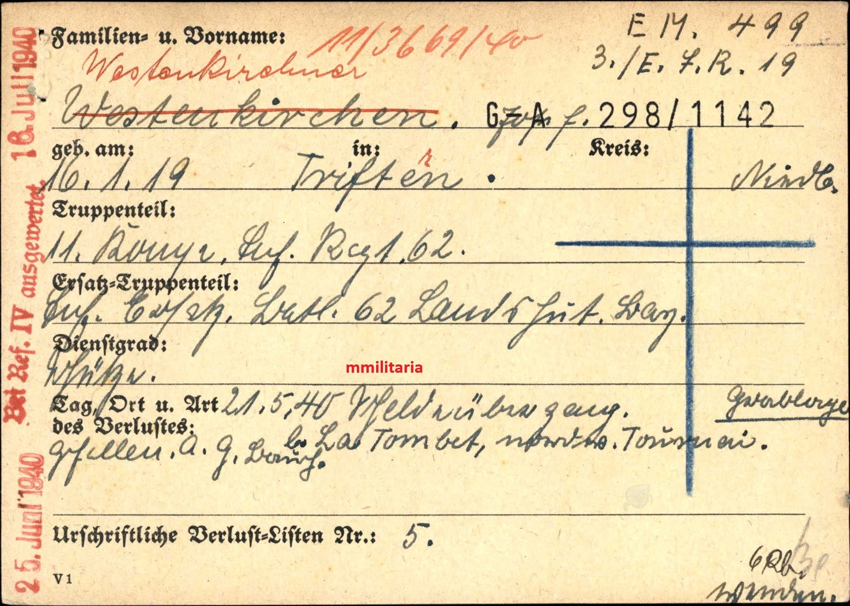 Gefallen am 21.06.1940 bei Tournai (Belgien)