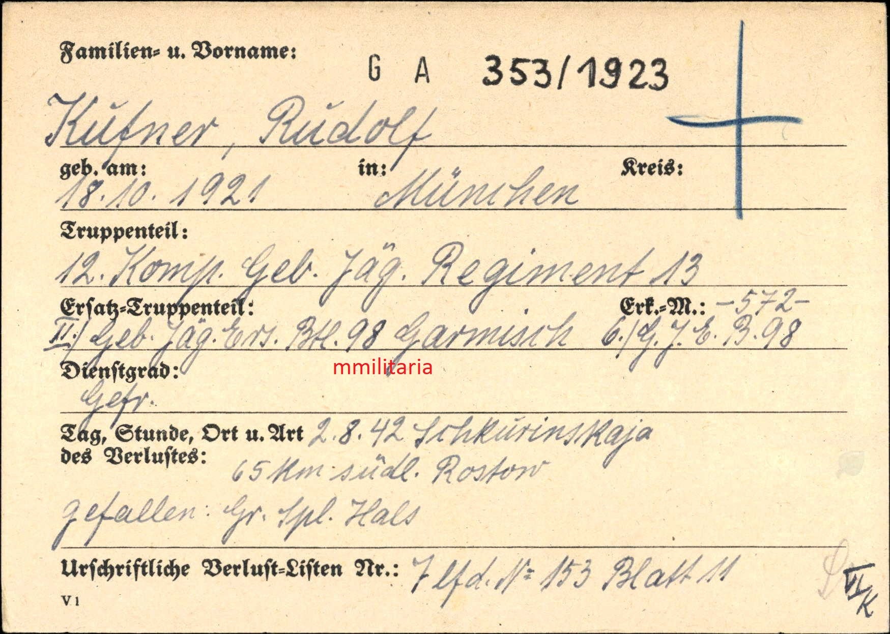 Sterbebild Gefreiter München 12. Komp. Geb. Jäger Regiment 13 Bataisk Rostow Russland