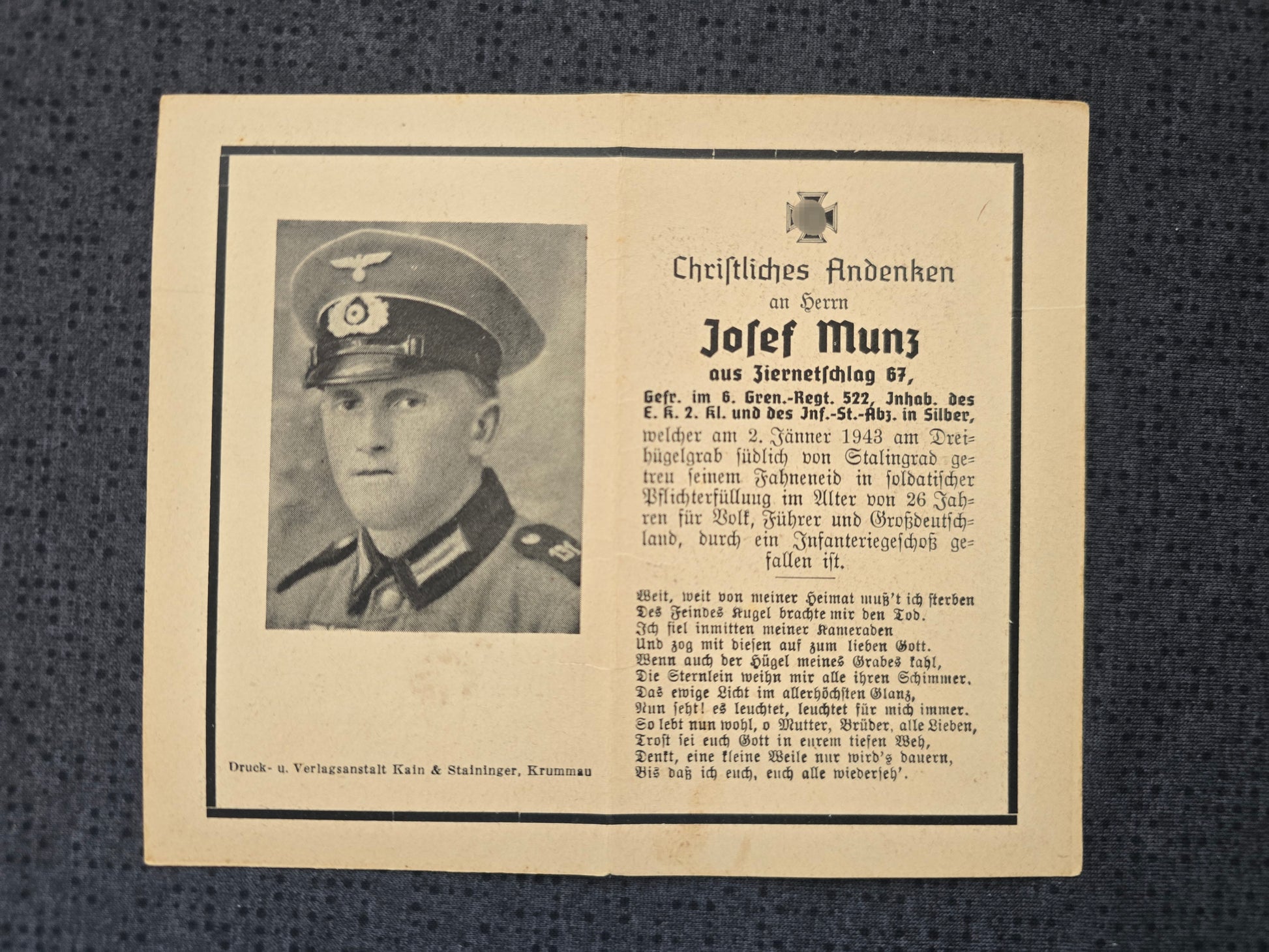 Sterbebild Gefreiter Ziernetschlag 6. Gren. Regt. 522 Dreibügelgrab südlich Stalingrad Russland