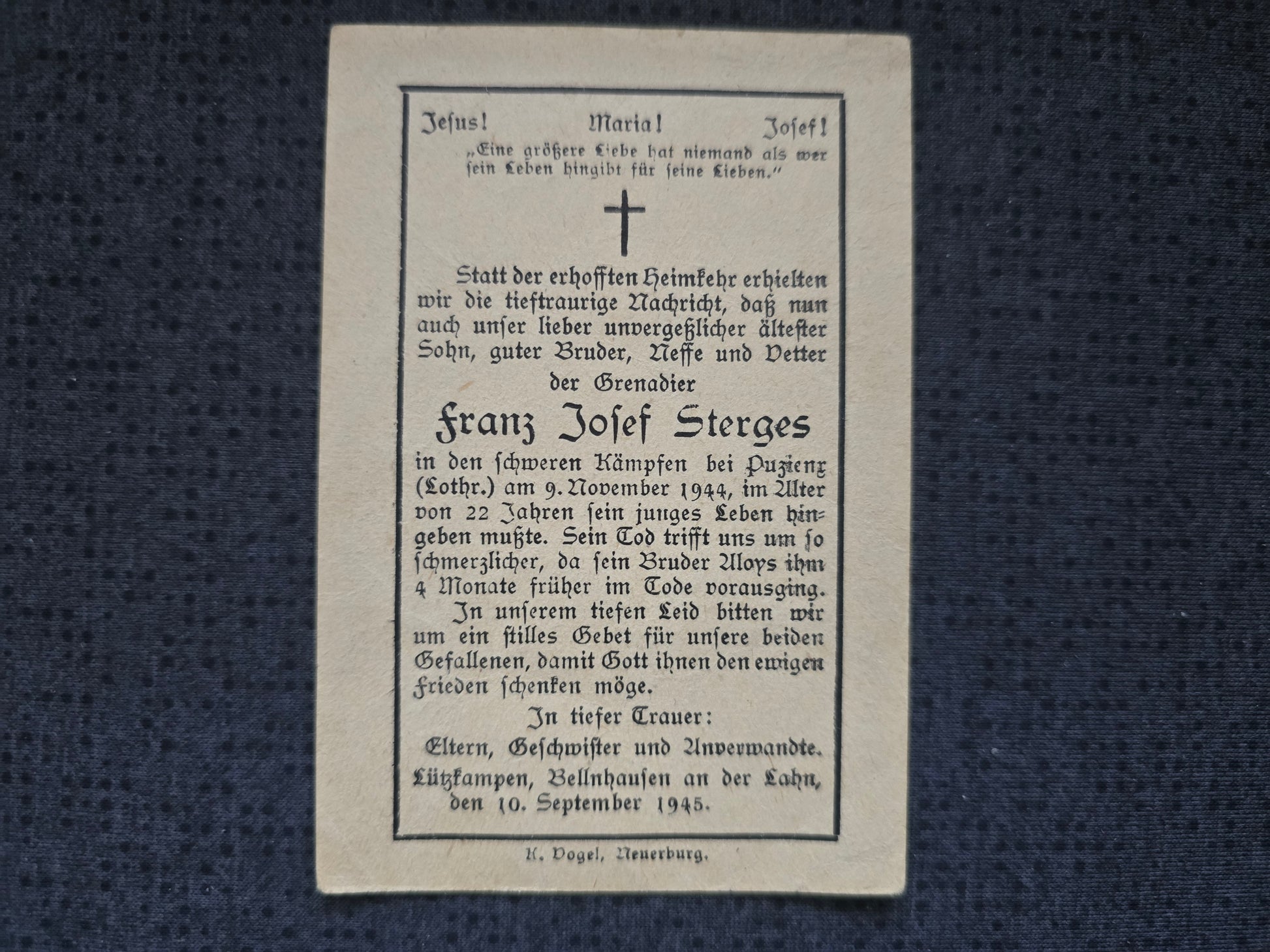 Sterbebild Grenadier Lichtenborn Stab Komp. Gren. Regt. 127 Purieux Lothringen Andilly Frankreich