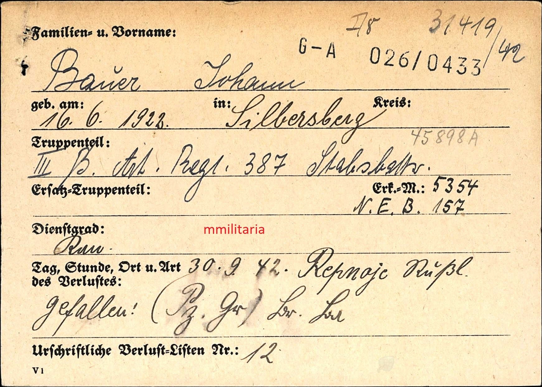 Gefallen am 30.09.1942 bei Repnoje (Russland)