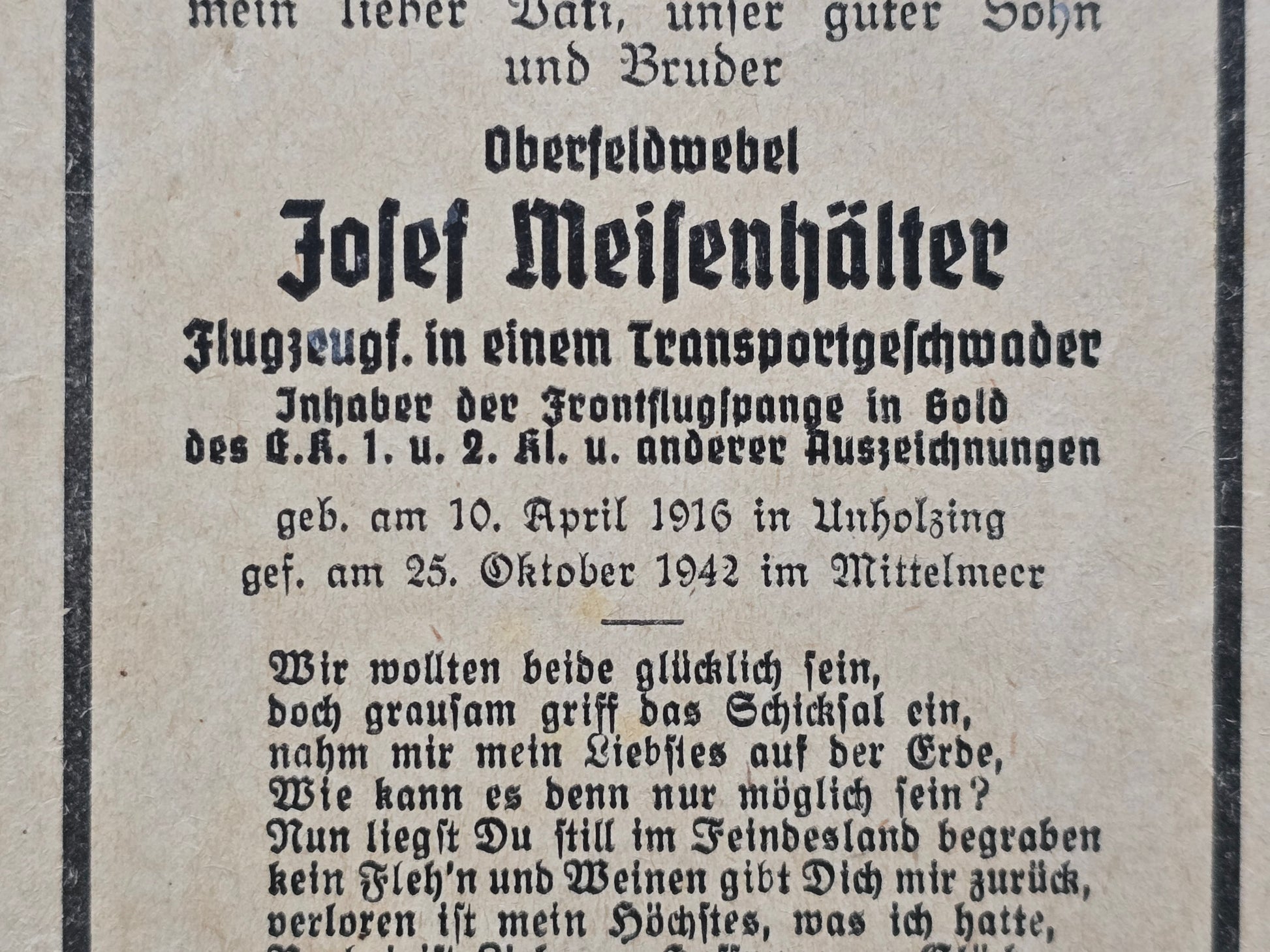 Gefallen am 25.10.1942 auf dem Flug von Kreta nach Afrika im Mittelmeer