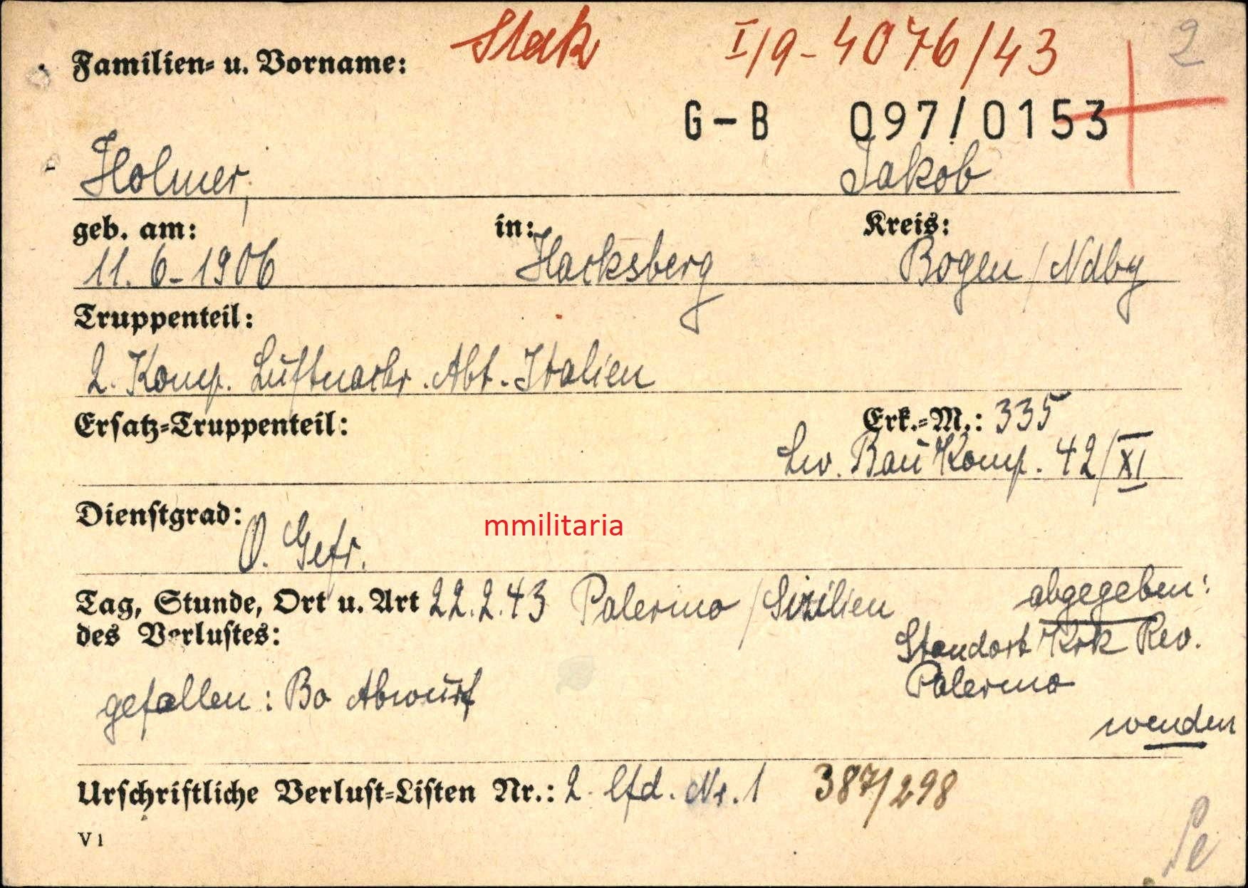 Gefallen am 22.01.1943 bei Palermo / Sizilien (Italien)