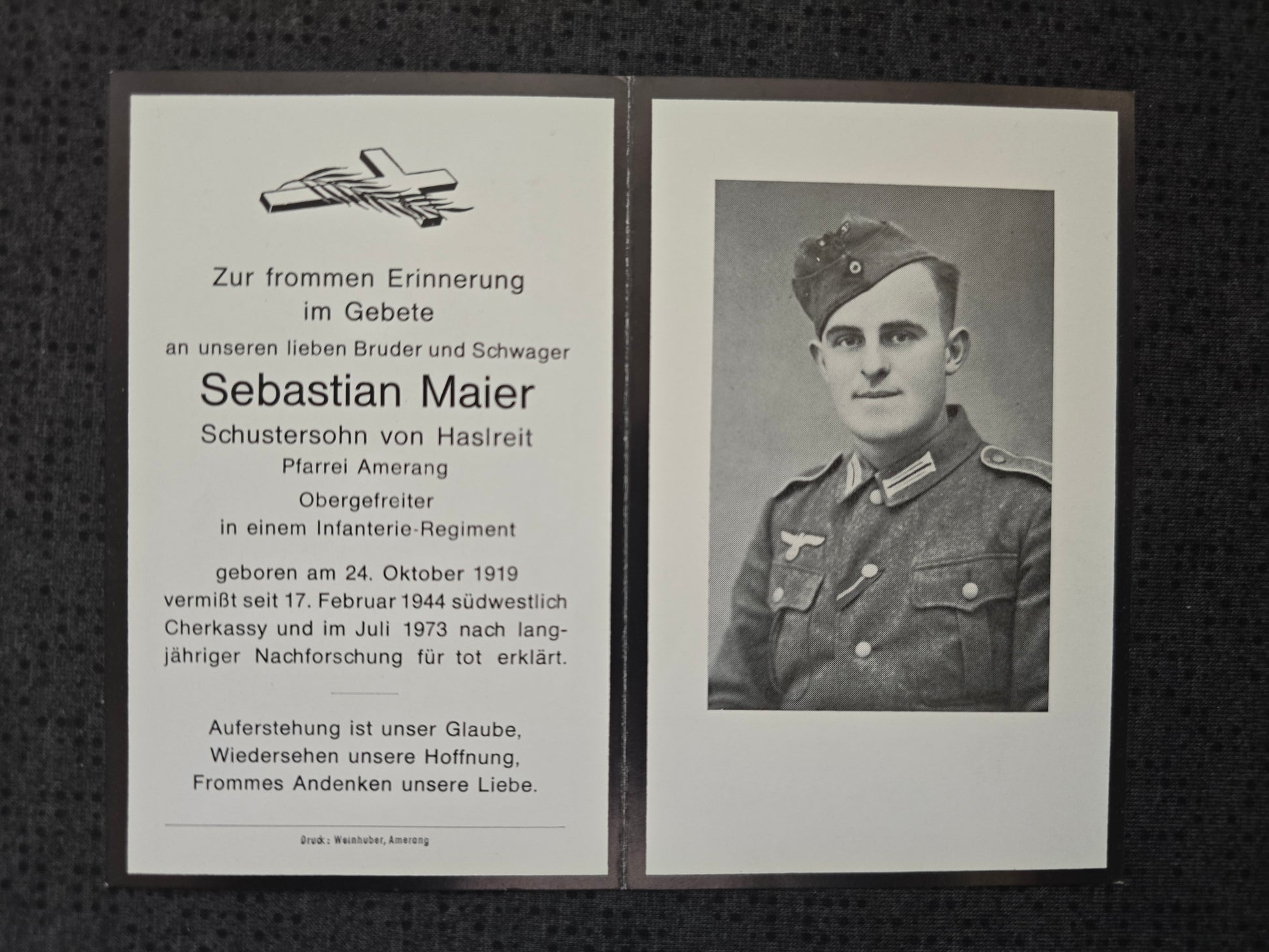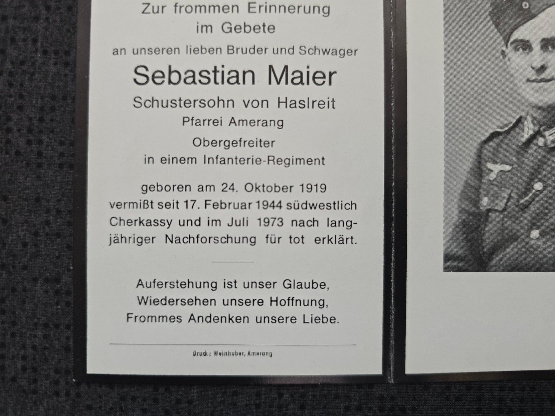 Sterbebild Obergefreiter Amerang Infanterie Regt. vermisst 1944 Tscherkassy 1973 für tot erklärt
