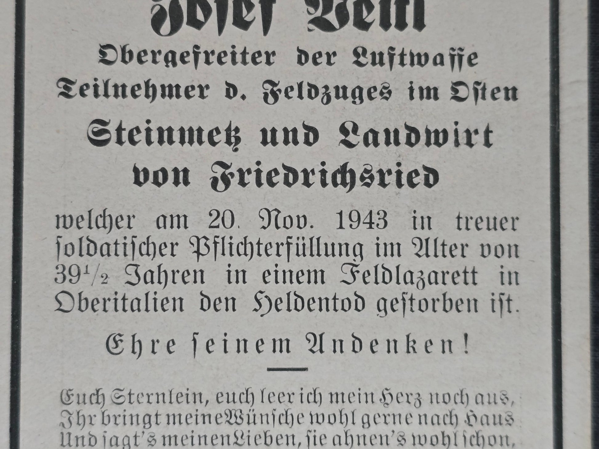 Sterbebild Obergefreiter Friedrichsried Luftwaffe Italien