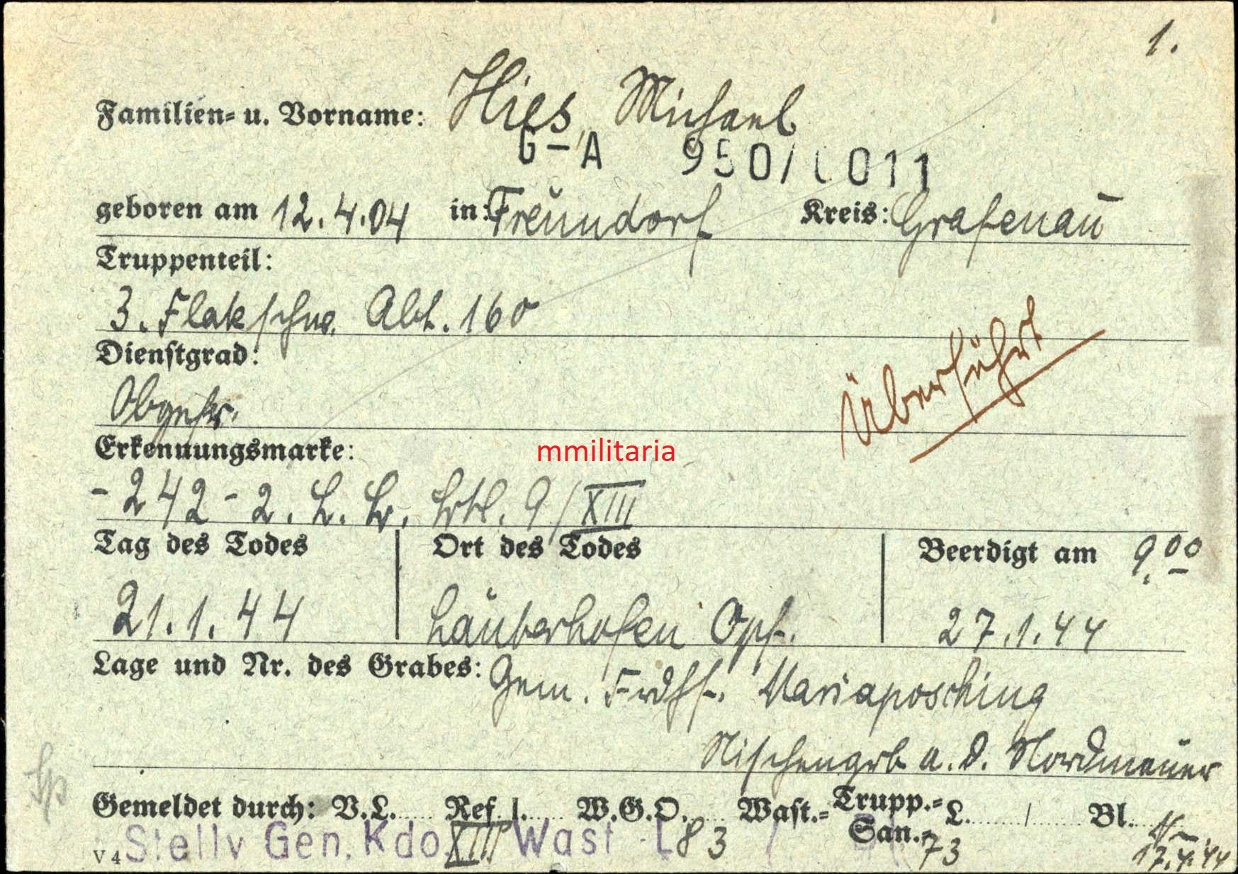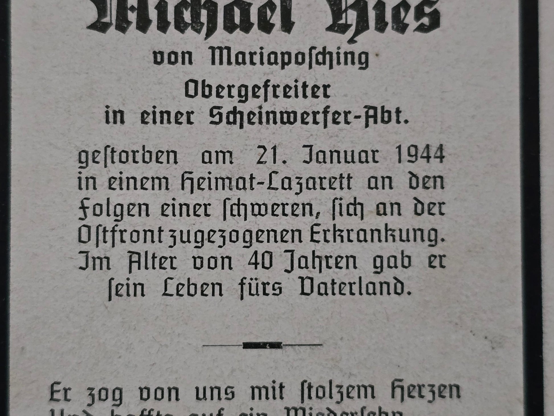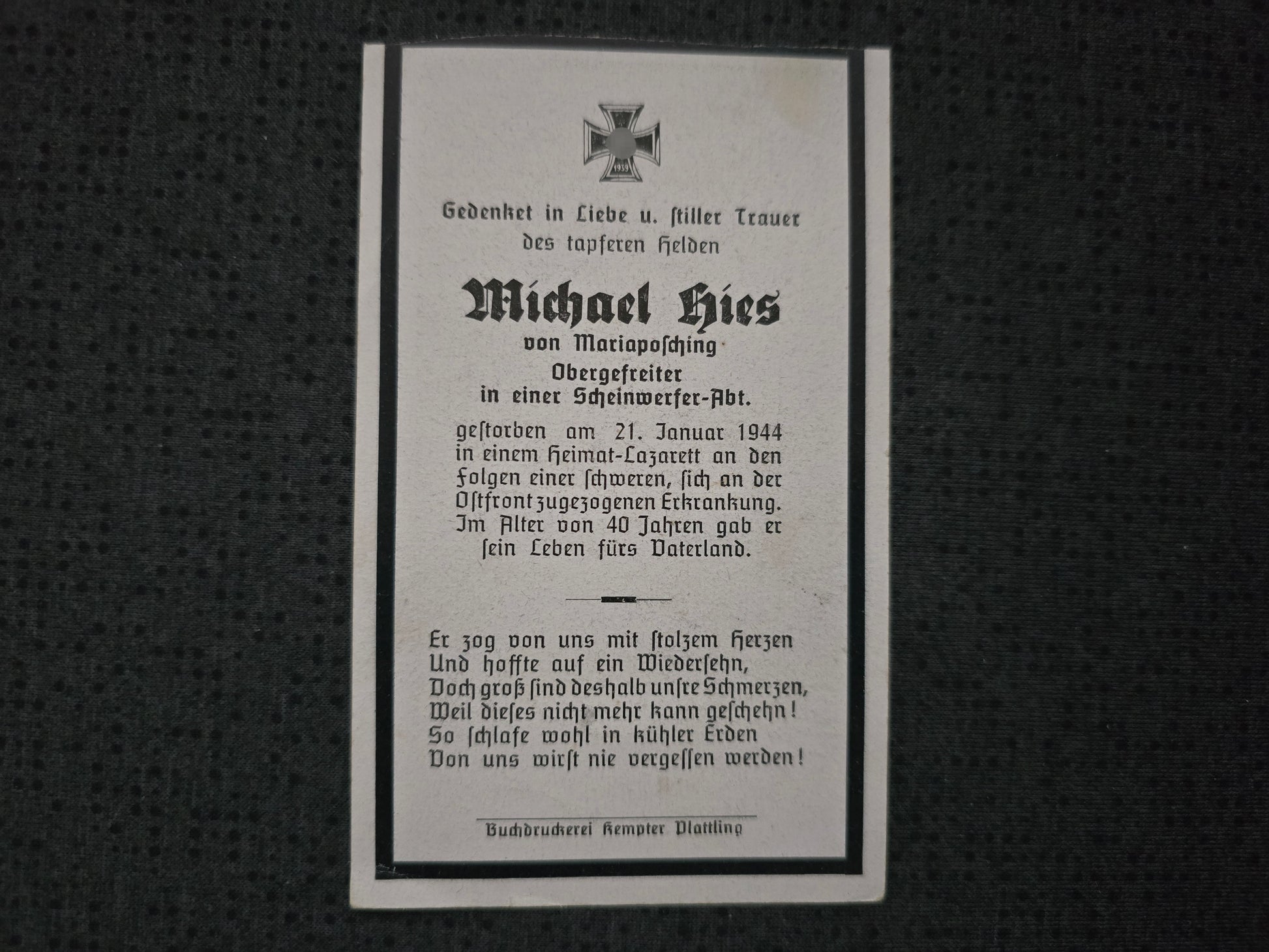 Sterbebild Obergefreiter Mariaposching 3. Flak Abt. 160 Scheinwerfer Abt. Ostfront