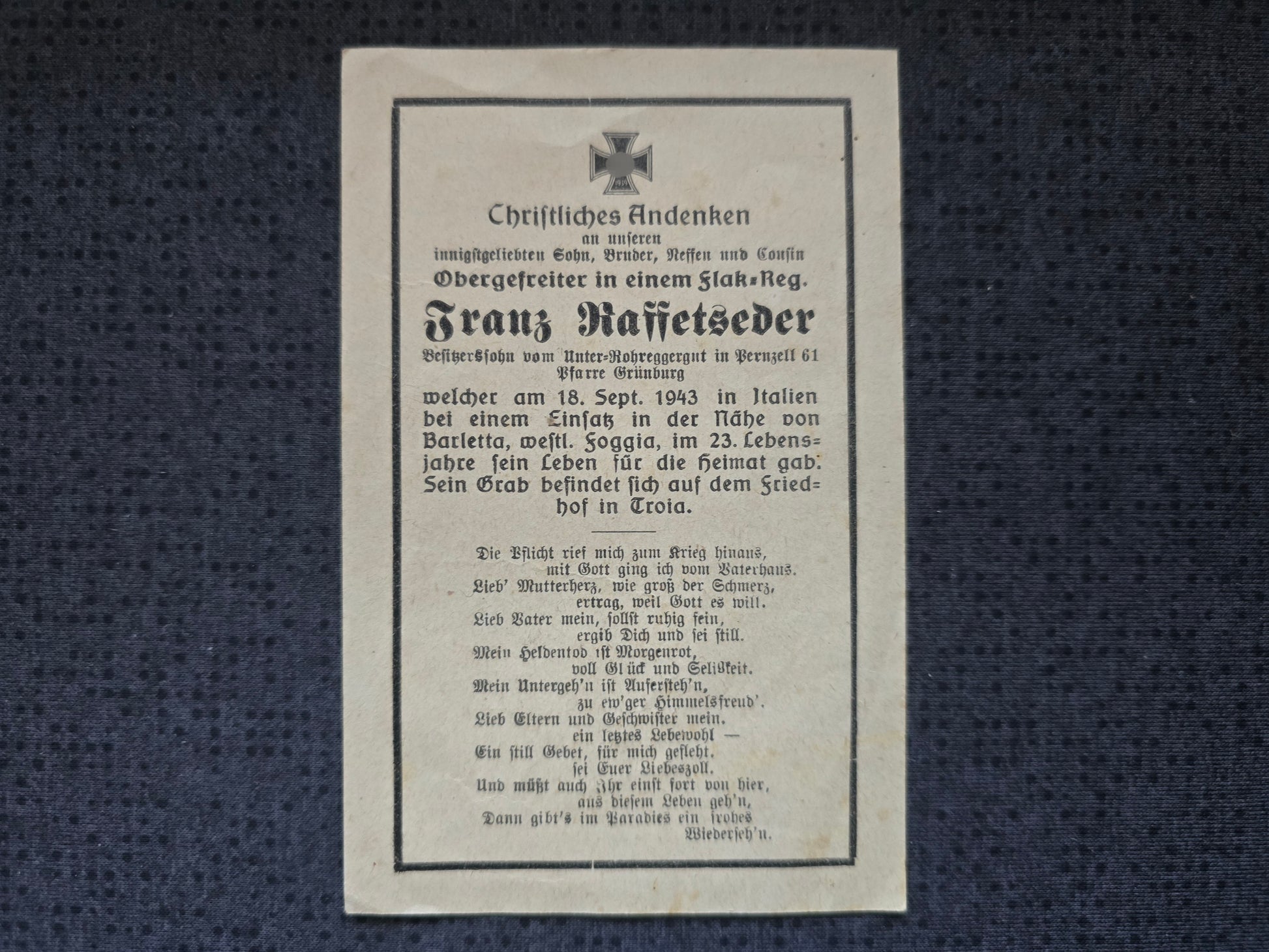Sterbebild Obergefreiter Schönau 2. Leichte Flak Abt. 851 Barletta Segezia Foggia Italien