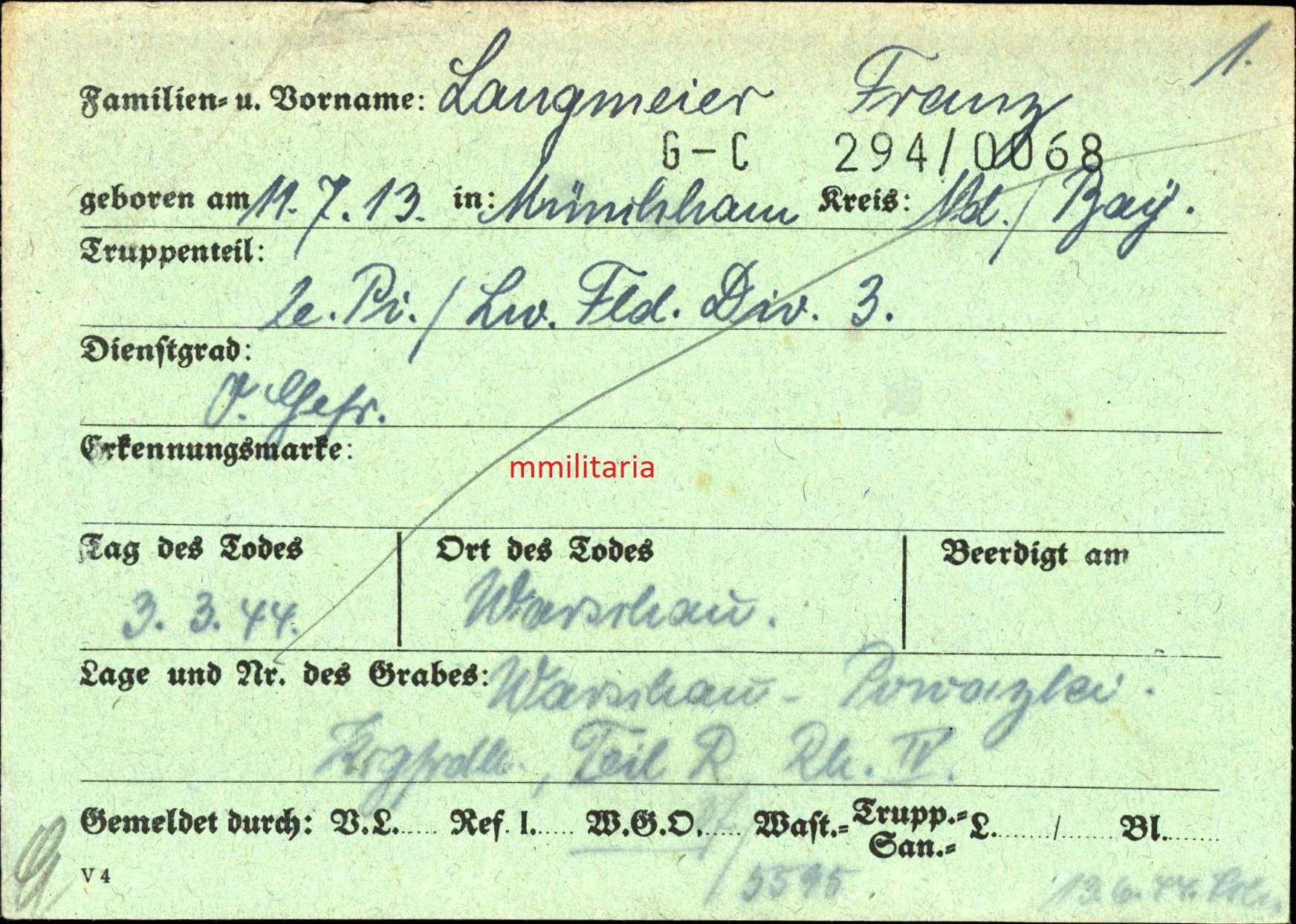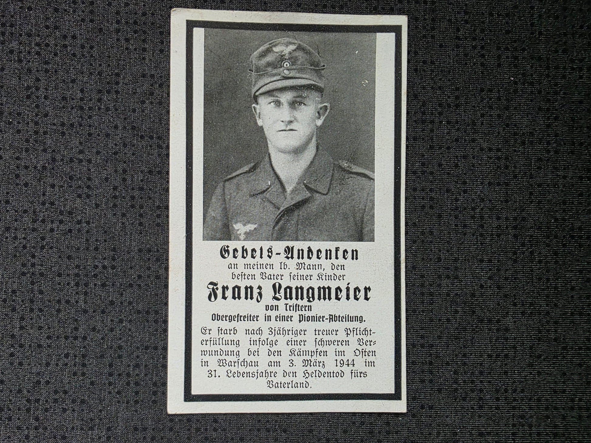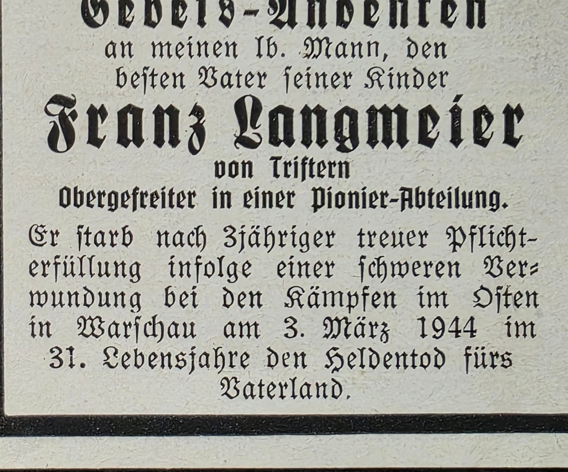 Sterbebild Obergefreiter Triftern Pionier-LW Feld Div. 3 Res.Laz. VIII Warschau Polen