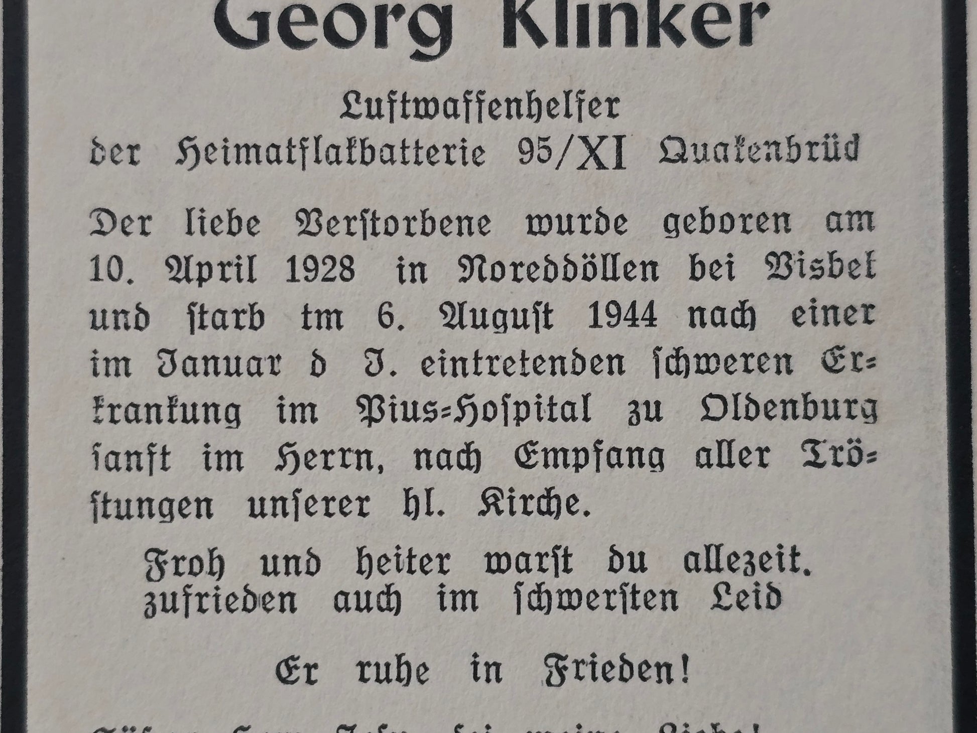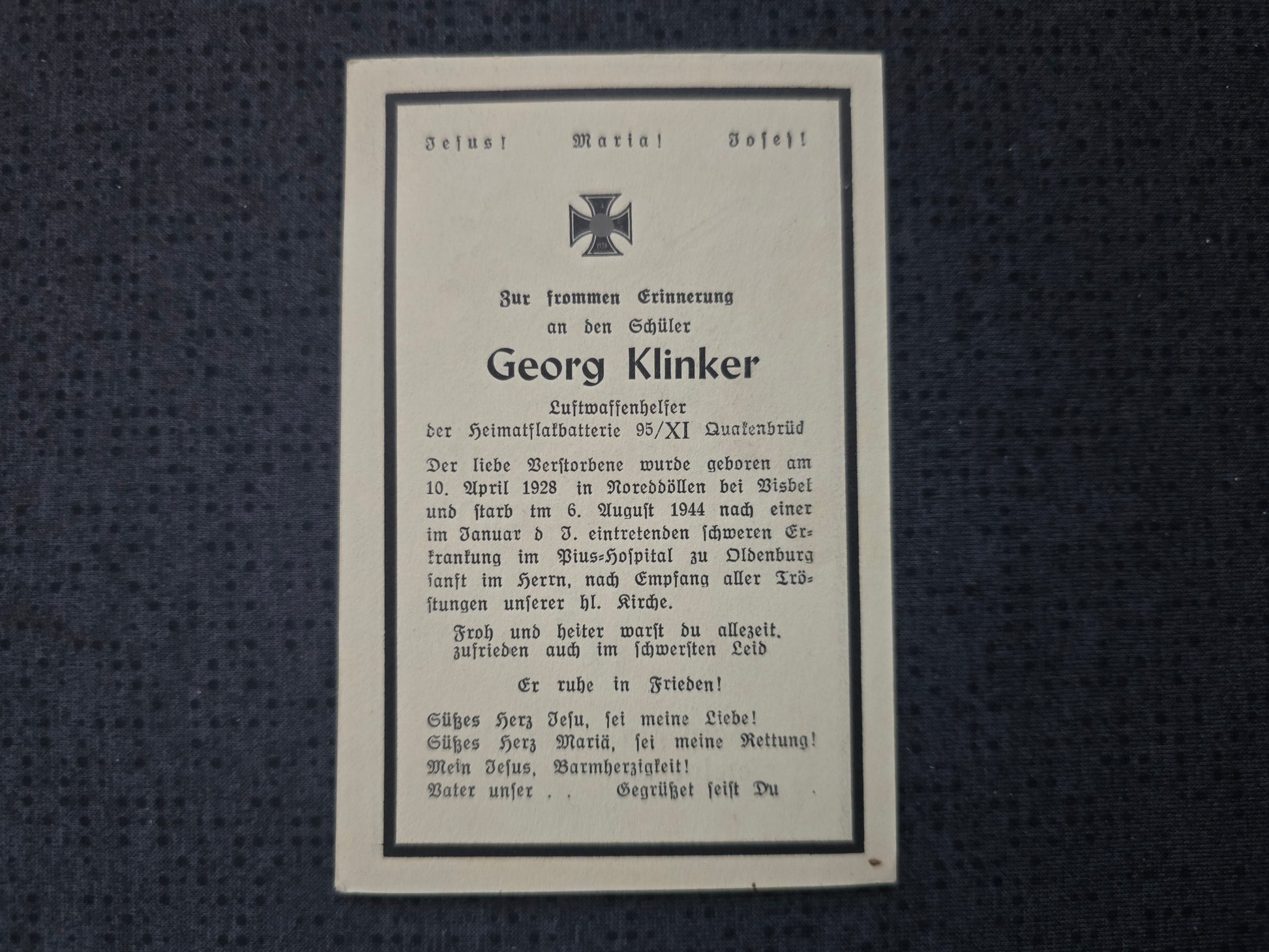 Sterbebild Schüler Luftwaffenhelfer 16 Jahre Heimatflakbatterie 95/XI Quackenbrück Pius Hospital Oldenburg