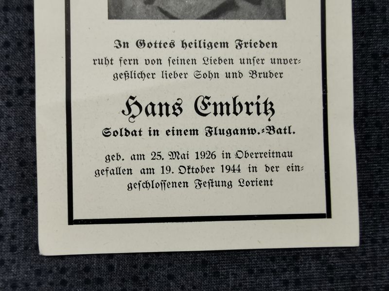 Sterbebild Schütze Oberreitnau Fluganwärter Btl. Festung Lorient Bretagne Frankreich