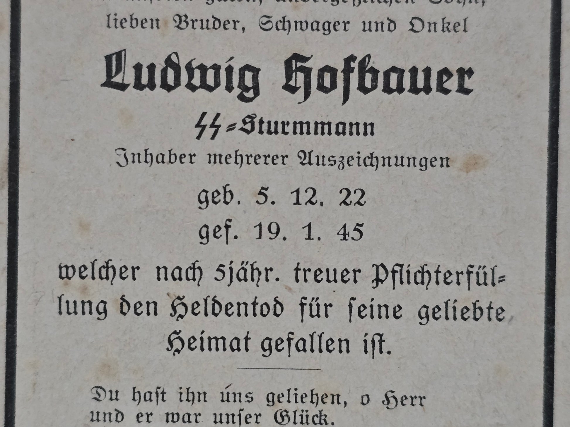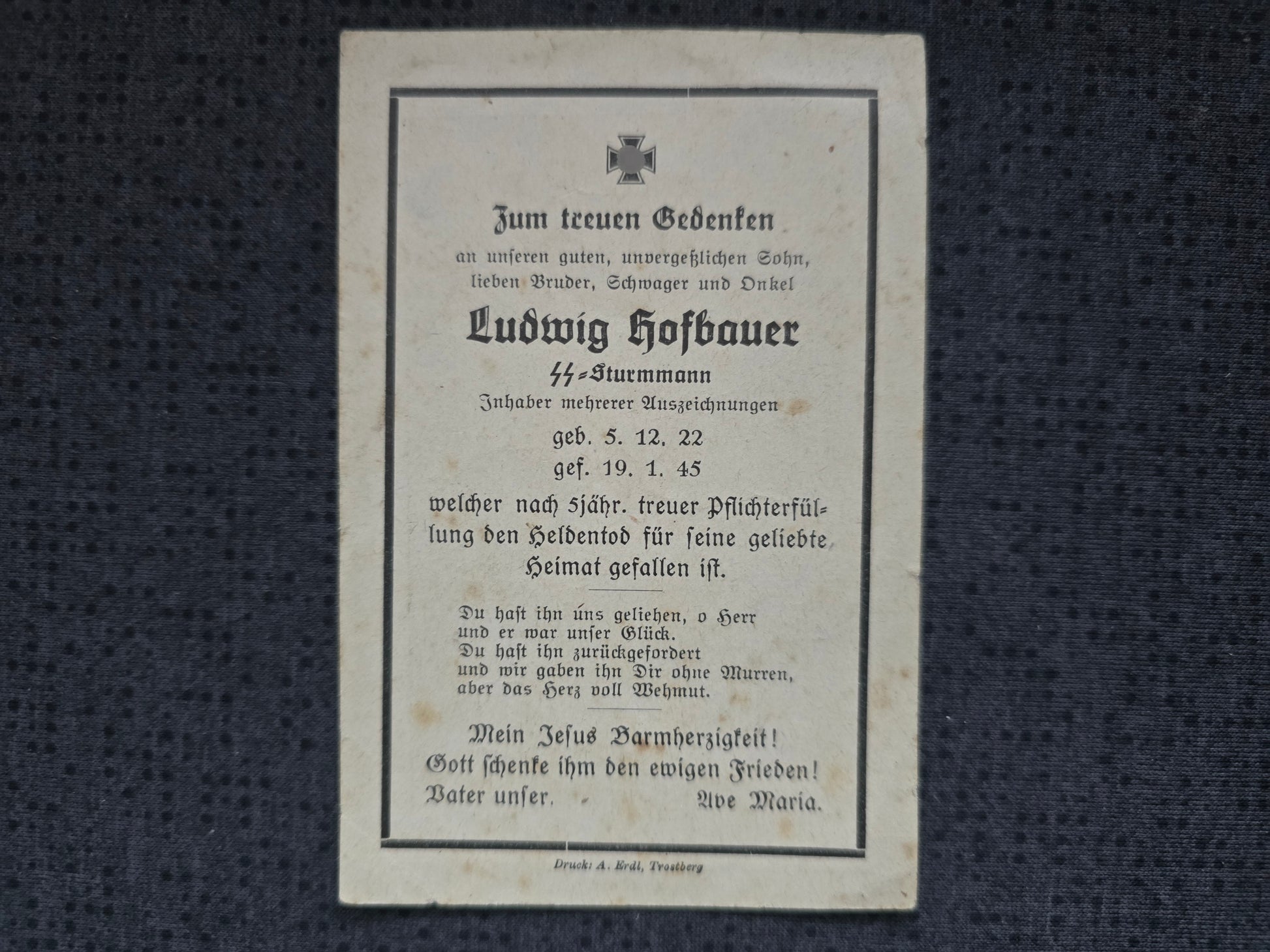 Sterbebild SS-Sturmmann Steinberg Endkampf Niederbronn-les-Bains Frankreich