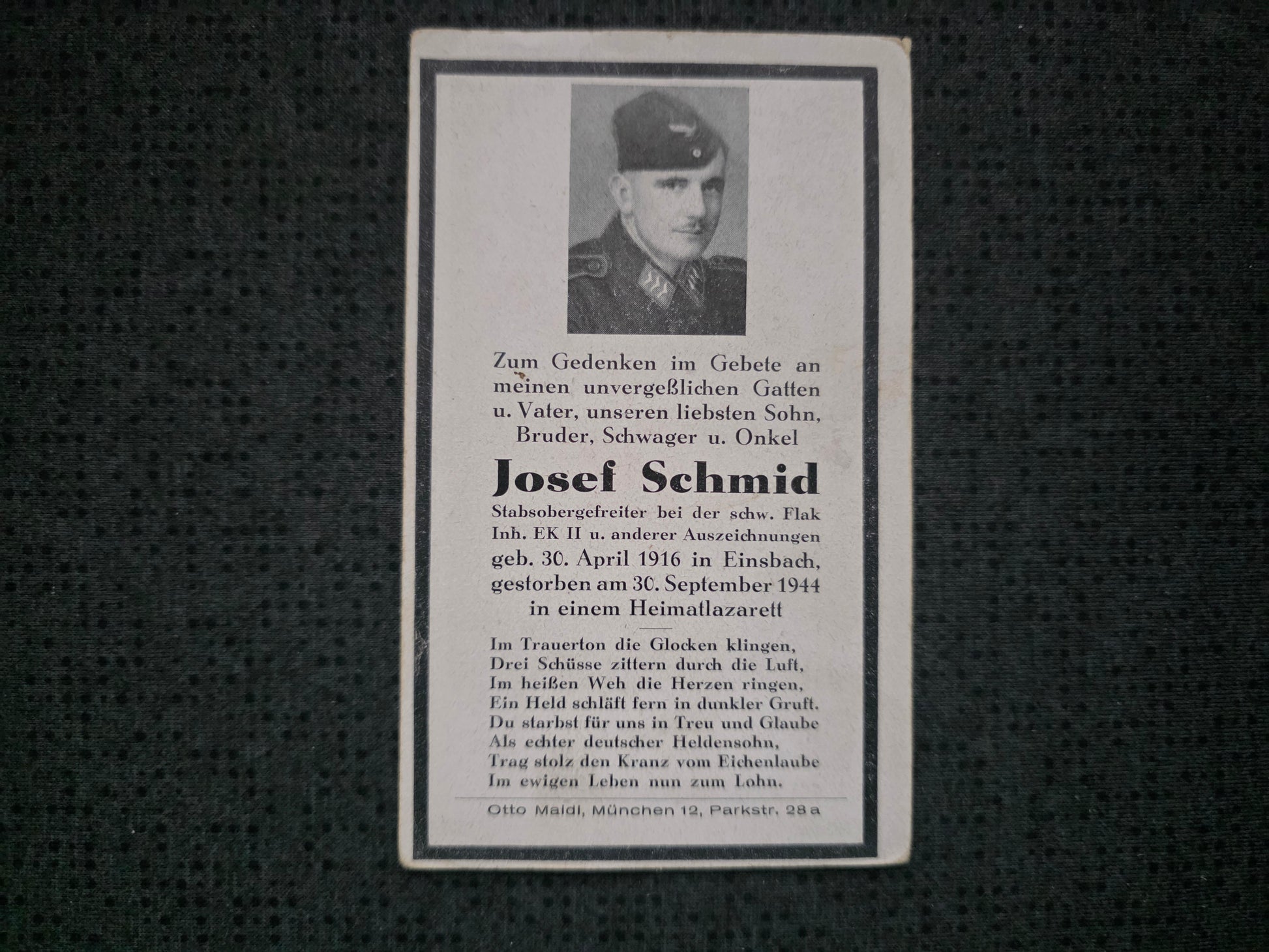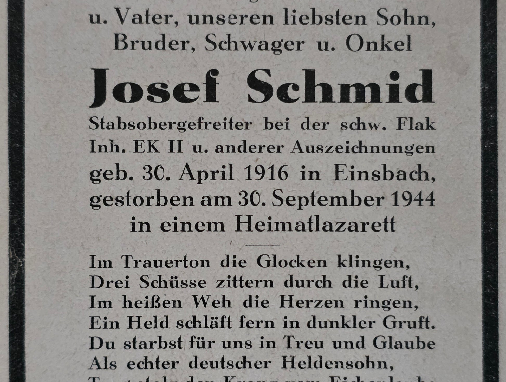 Sterbebild Stabsgefreiter Einsbach Schwere Flak Abt. Lazarett Landsberg/ Warthe Polen