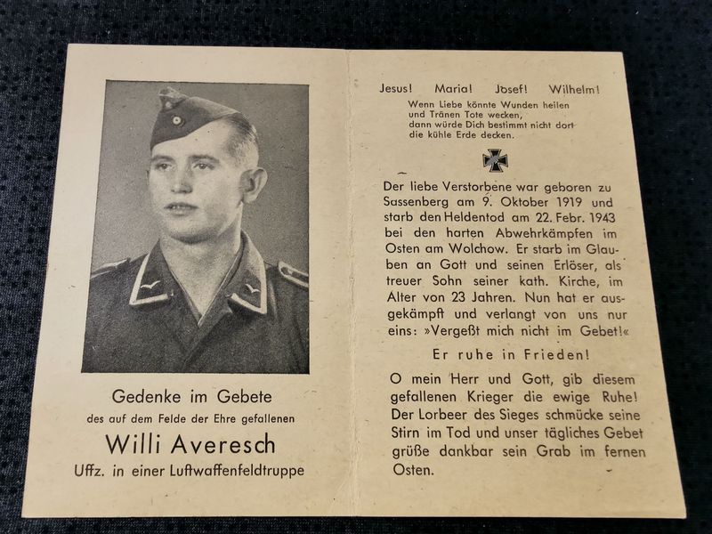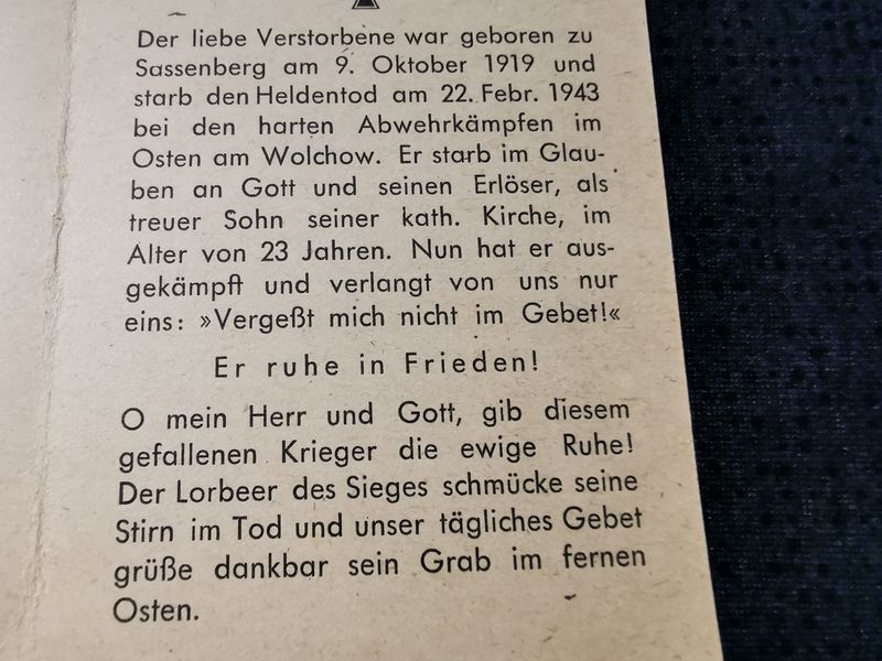 Sterbebild Unteroffizier 2. Komp. Lw. Jäger Regt. 25 schwere Abwehrkämpfe Wolchow Nowgorod Russland