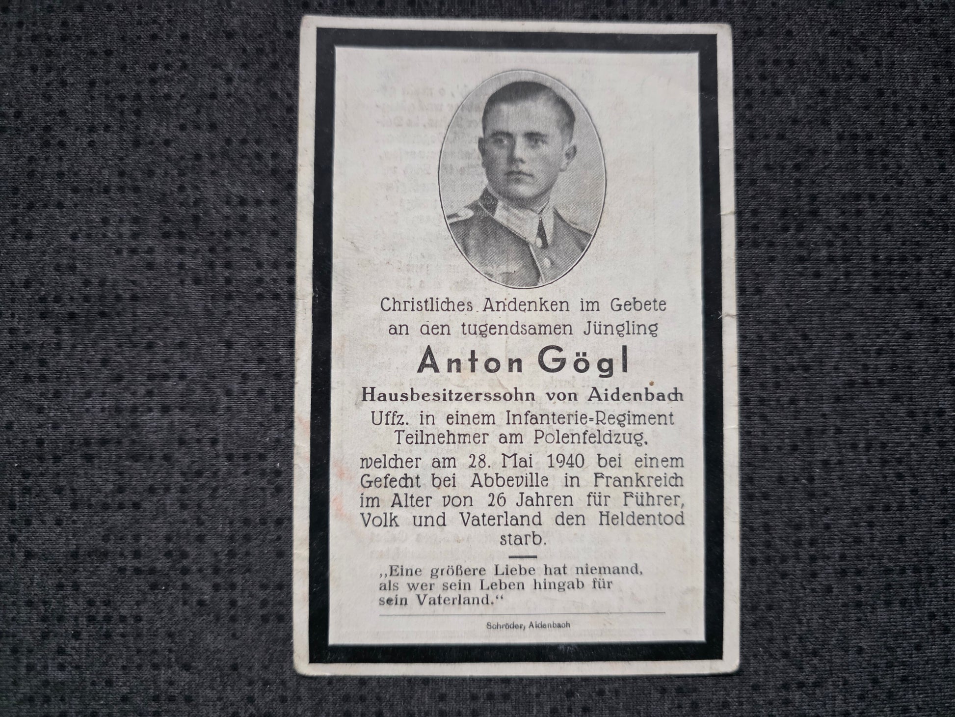 Sterbebild Unteroffizier Aidenbach 10. Komp. Inf. Regt. 217 Chaumont Abbeville Frankreich