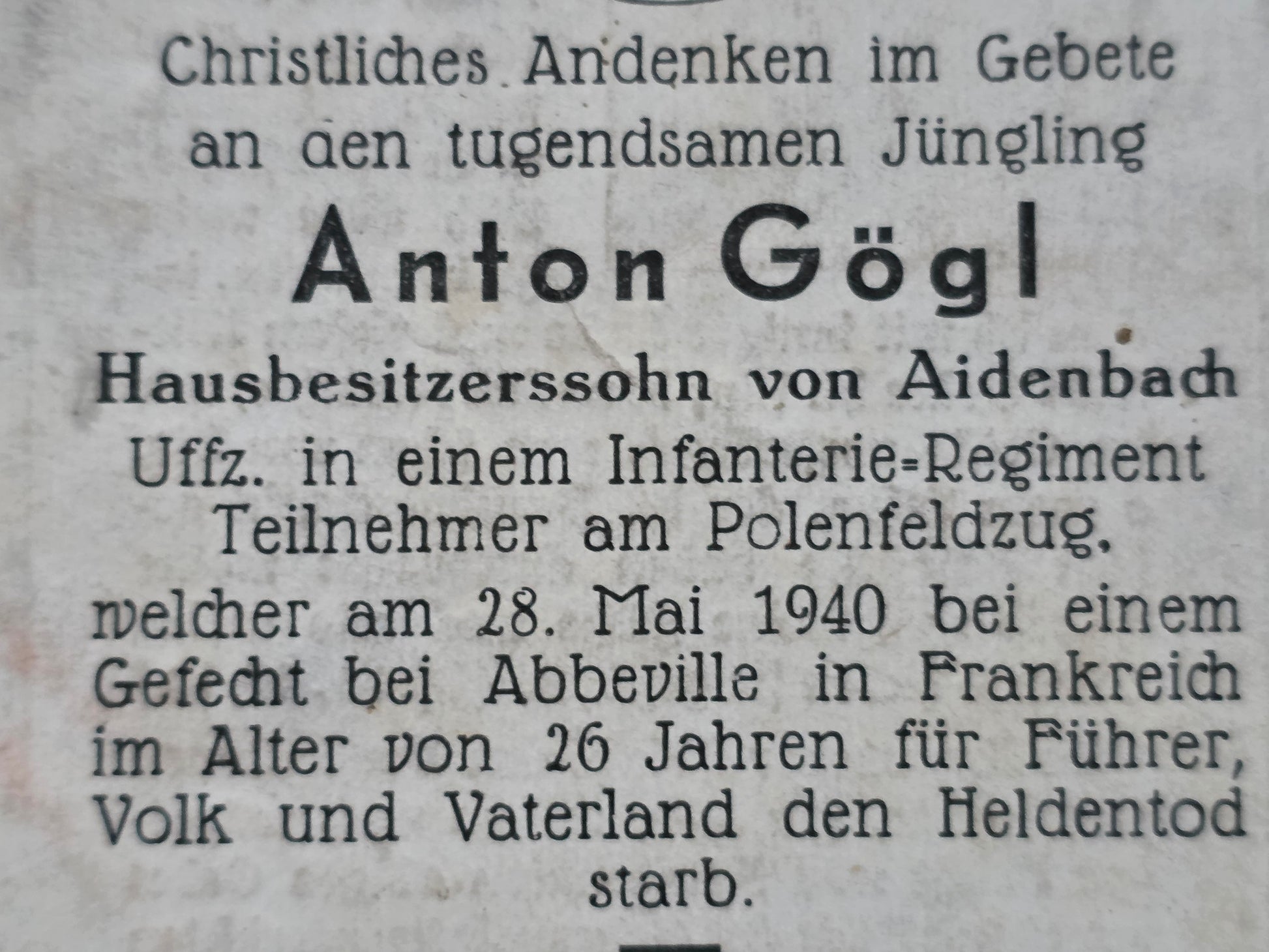 Gefallen am 28.05.1940 bei Chaumont / Abbeville (Frankreich)