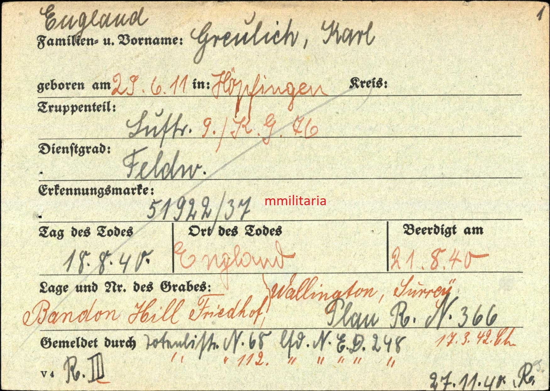 Gefallen am 18.08.1940 bei Kenley (England)