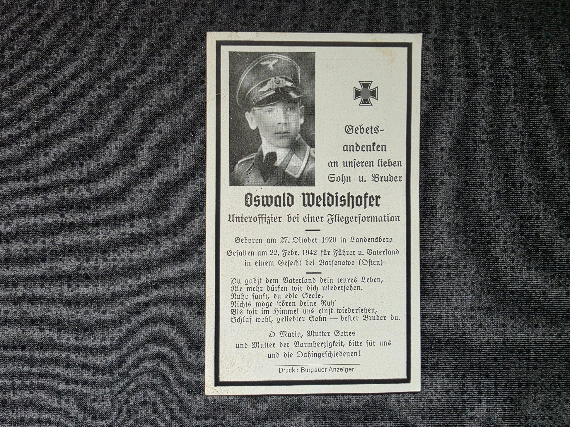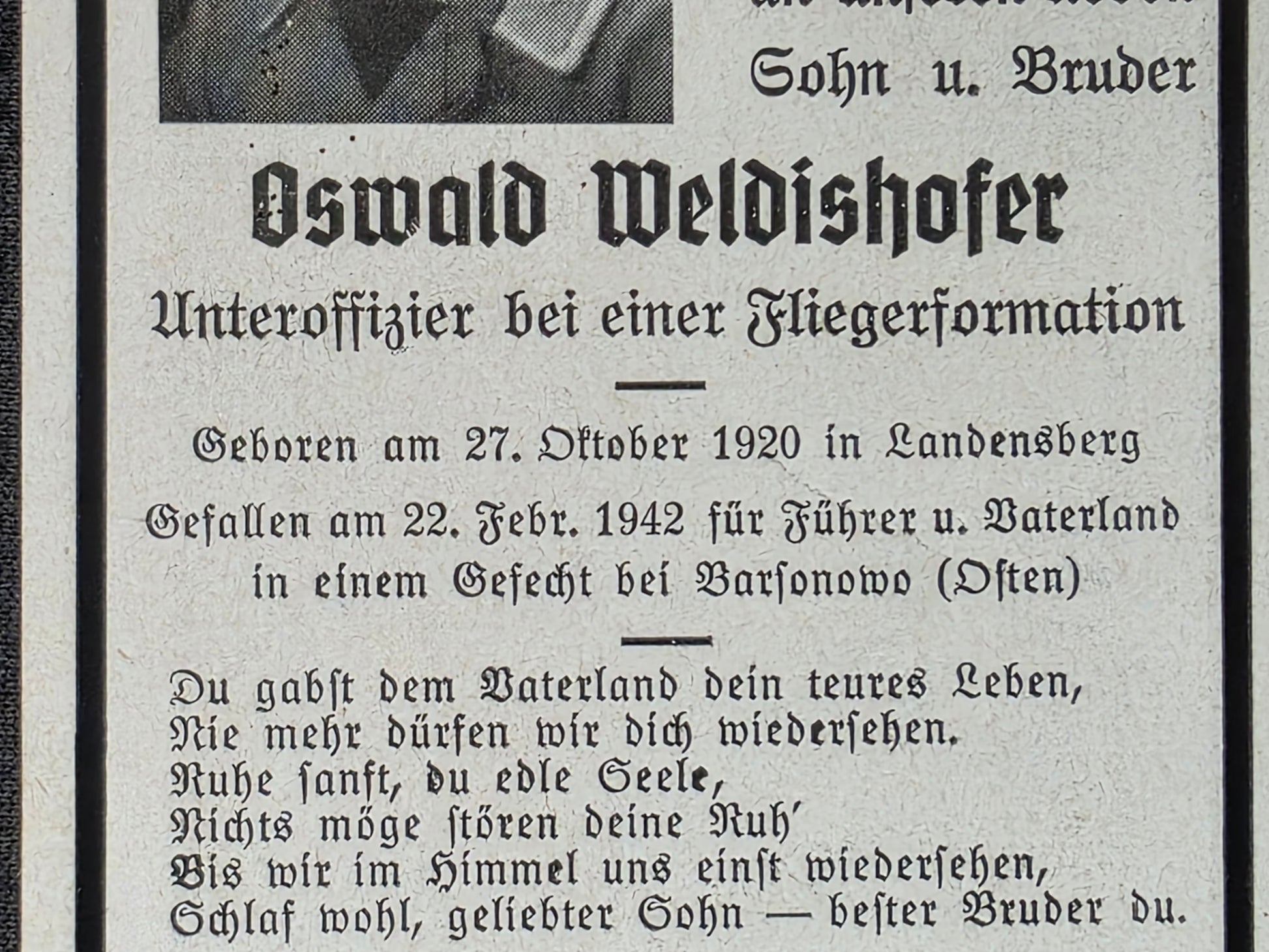 Sterbebild Unteroffizier Landensberg 9. Feld-Regt. der Luftwaffe Barsunowo Russland