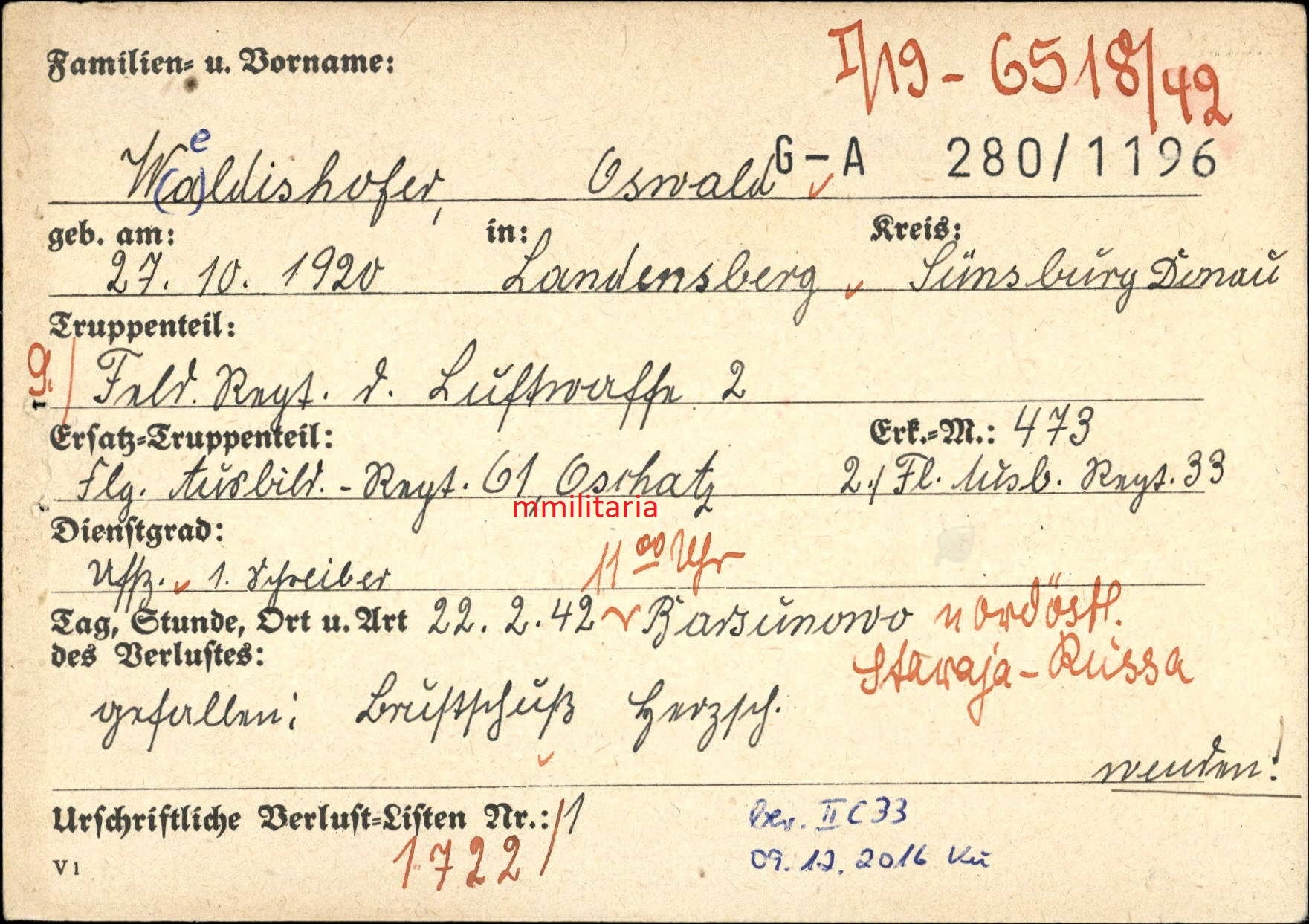Gefallen am 22.02.1942 bei Barsunowo (Russland)