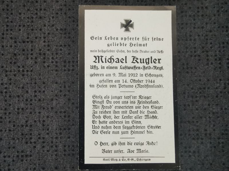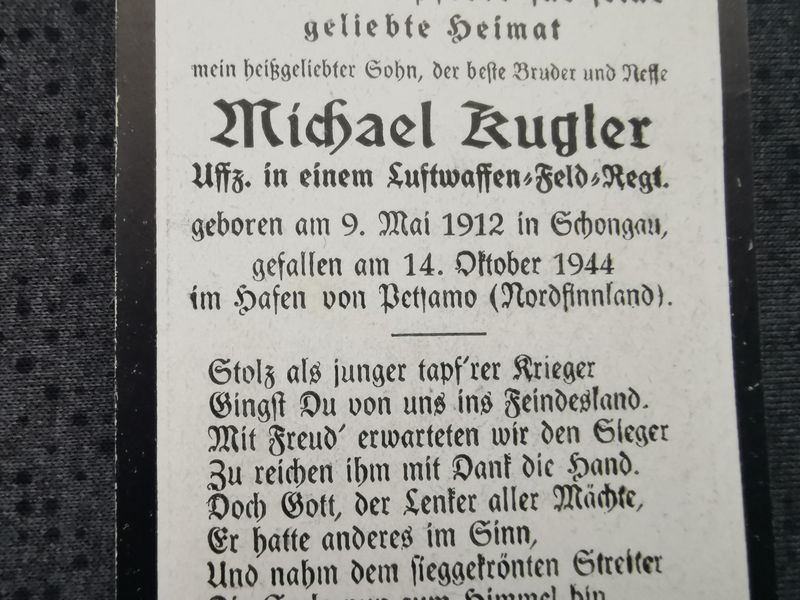 Sterbebild Unteroffizier Luftwaffen-Feld-Regt. Nibelungenhöhe Hafen Petsamo Finnland