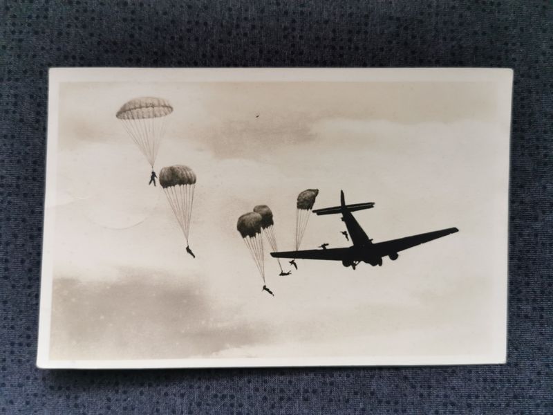 Foto-Ansichtskarte Postkarte "Unsere Luftwaffe" Fallschirmjäger beim Absprung