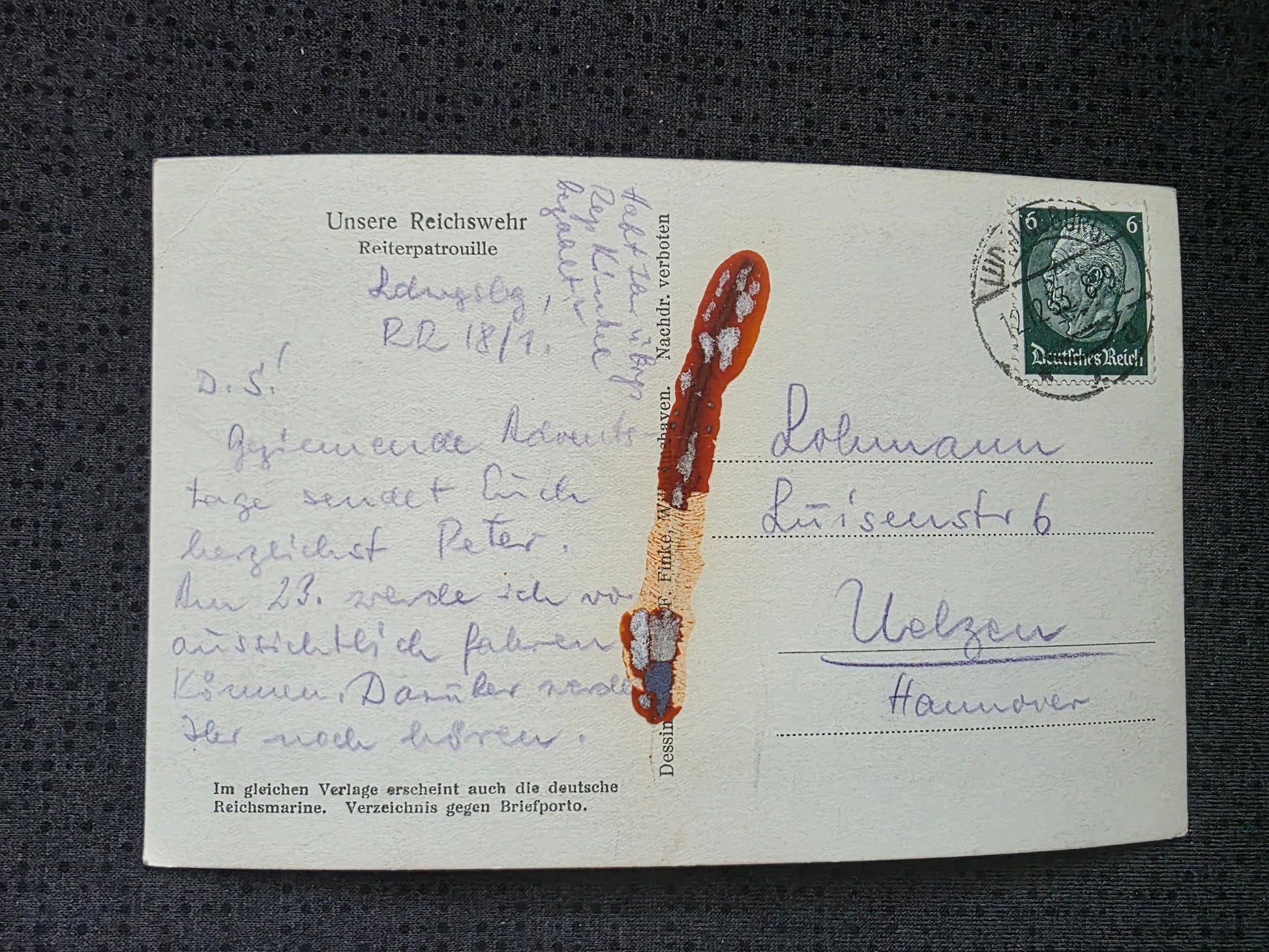 Beschriftet / inklusive Briefmarke & Stempel / mit Kleberesten