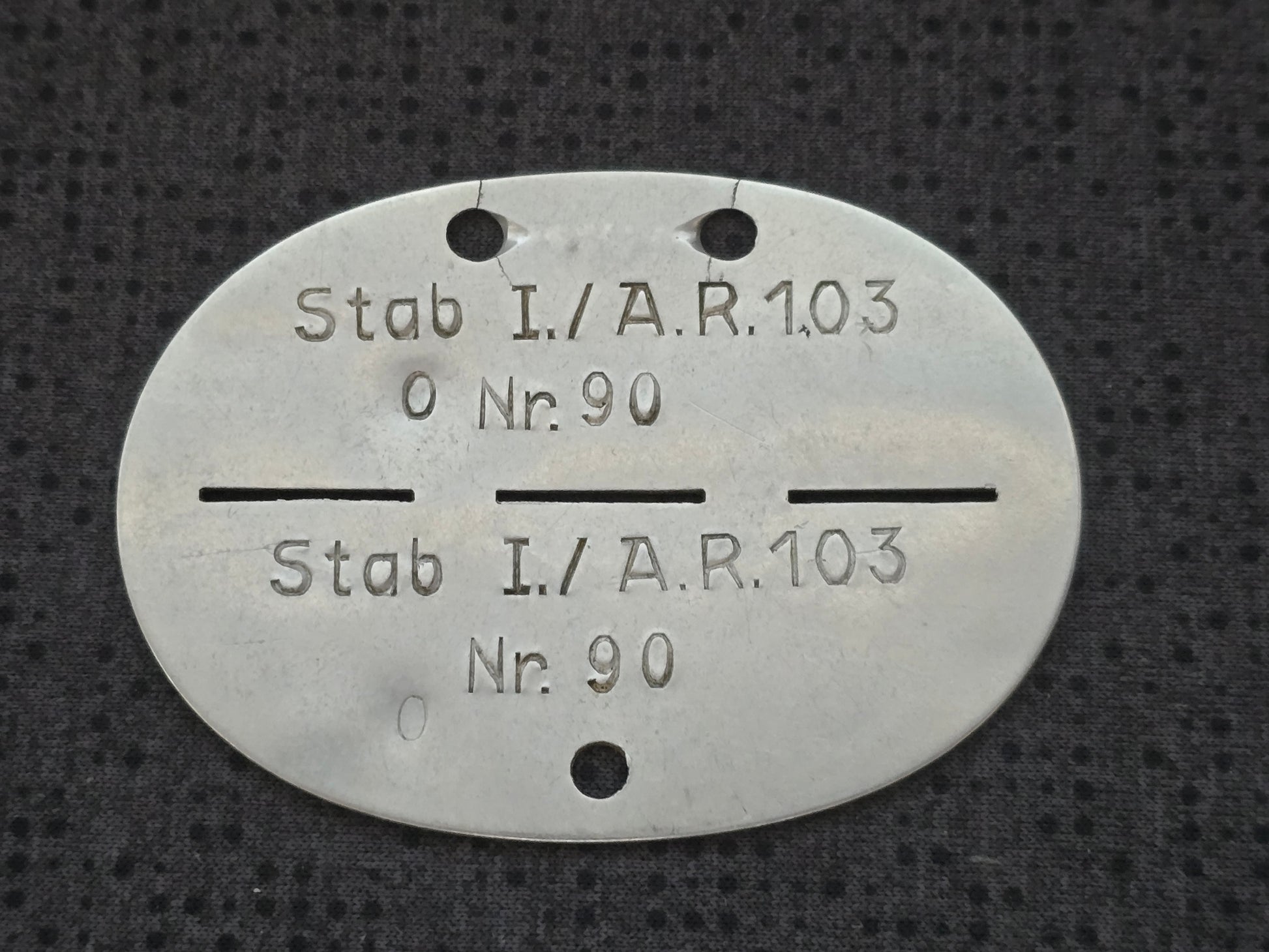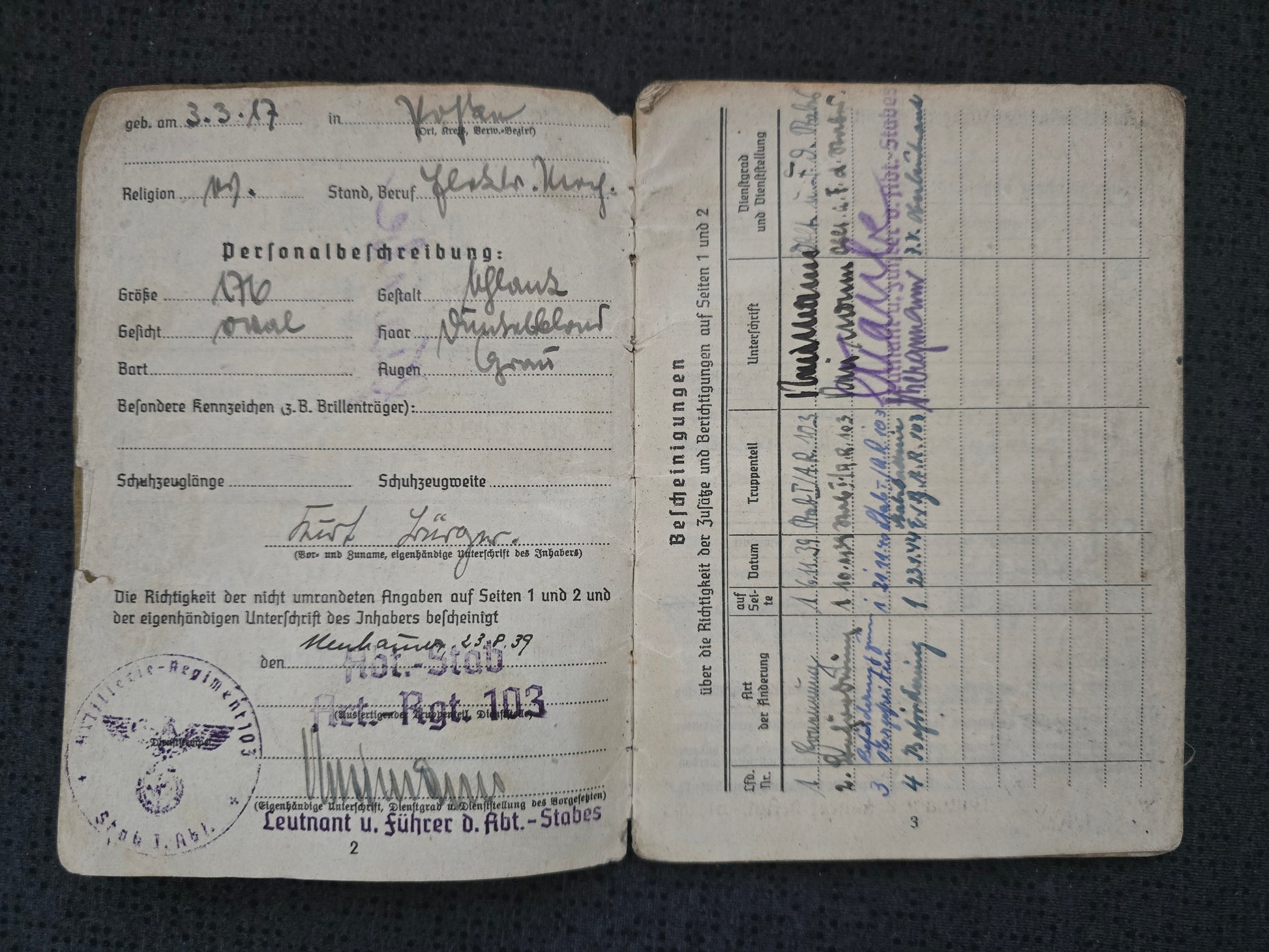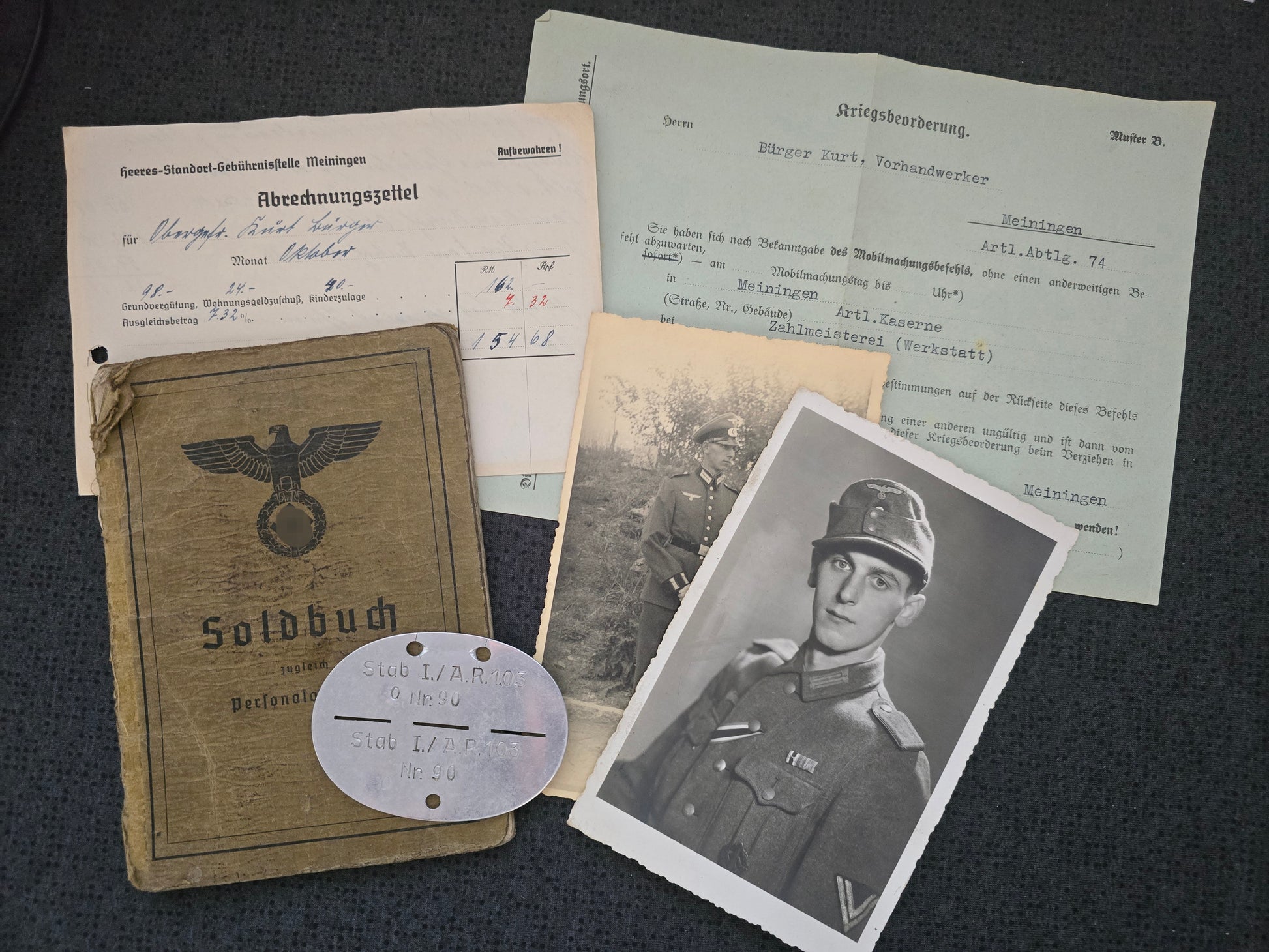 Konvolut Soldbuch + Papiere + Fotos + Erkennungsmarke Stab I Artillerie Regt. 103