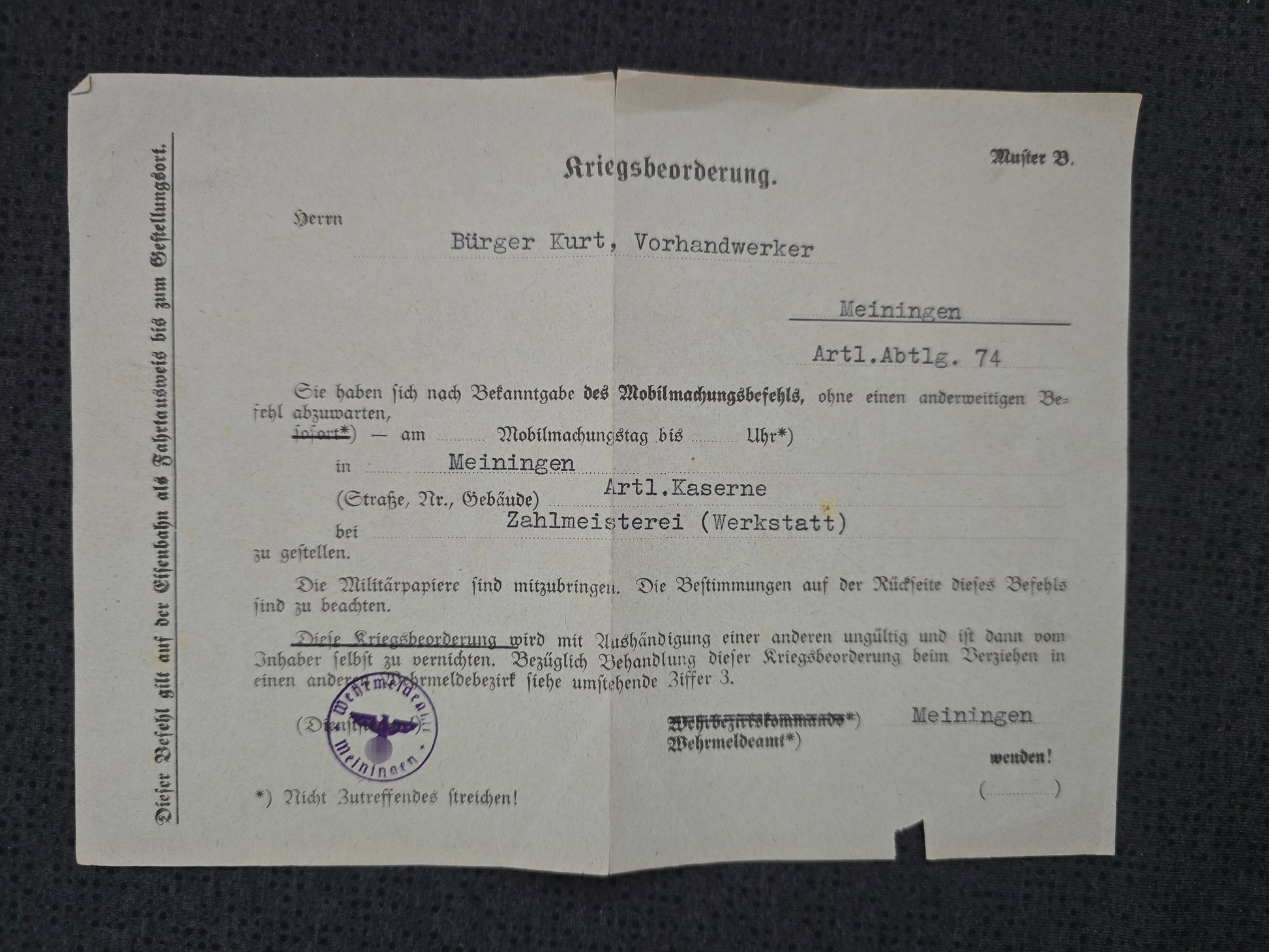 - Soldbuch (Personalausweis) K. Bürger Meiningen vom Stab I / Artillerie Regt. 103
