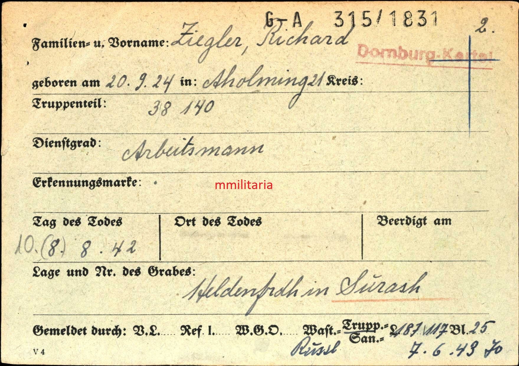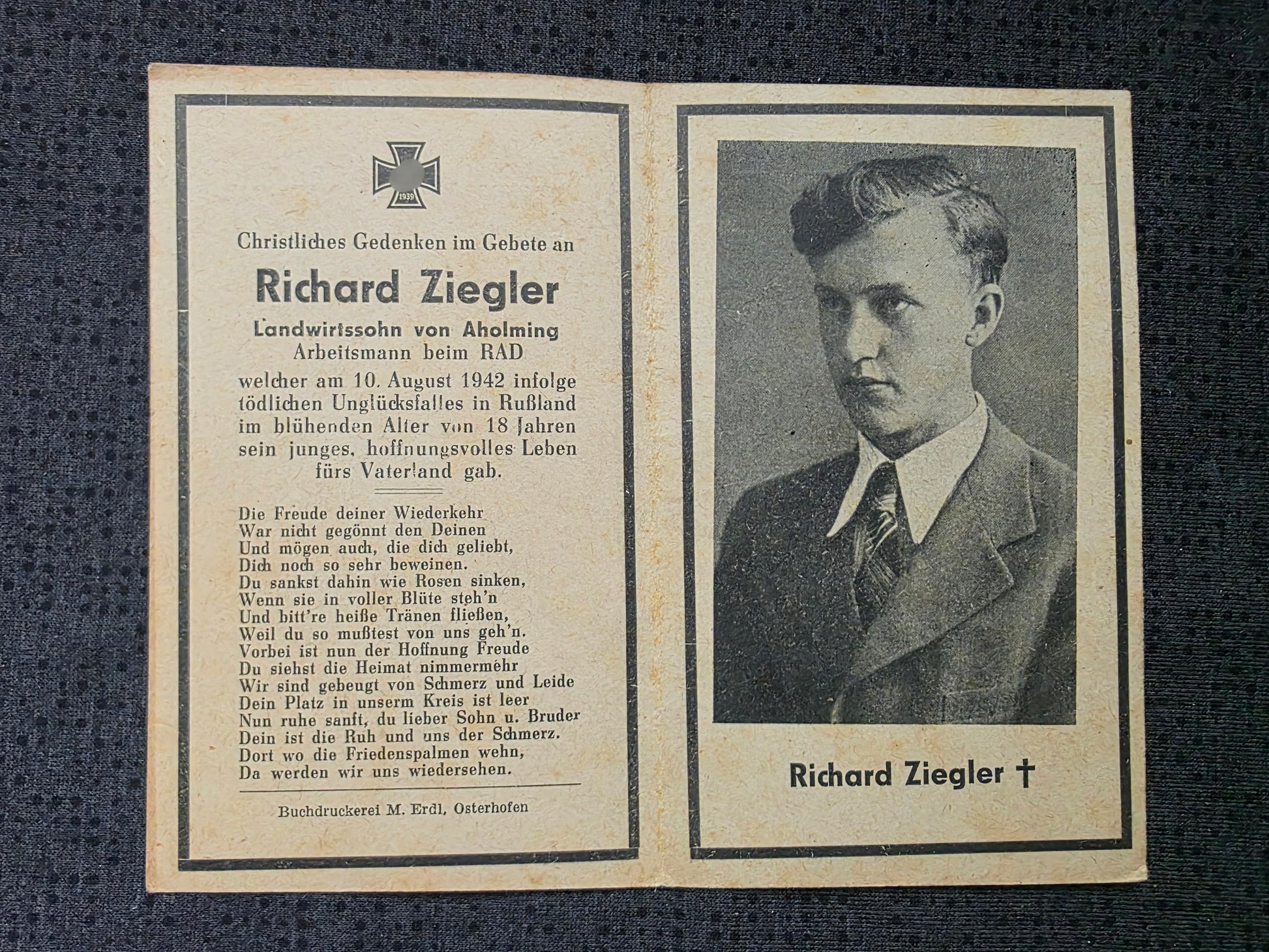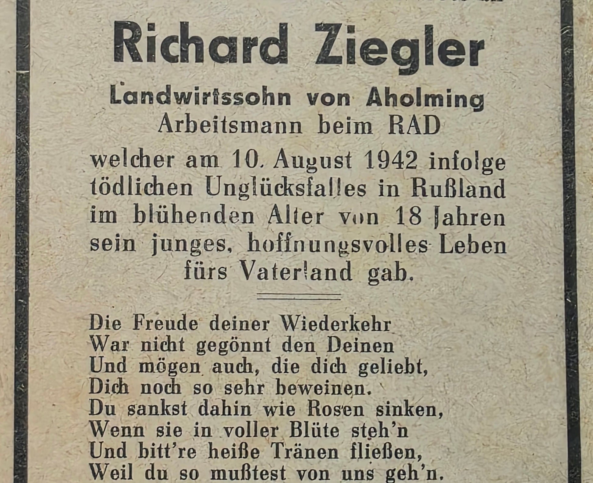 Sterbebild Arbeitsmann RAD Aholming 18 Jahre Surash Weissrussland