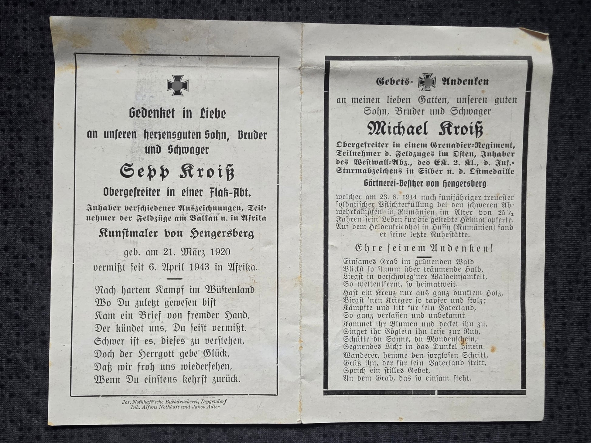 Sterbebild Brüder Hengersberg Obergefreiter Flak Abt. Afrika Obergefreiter Husi Rumänien