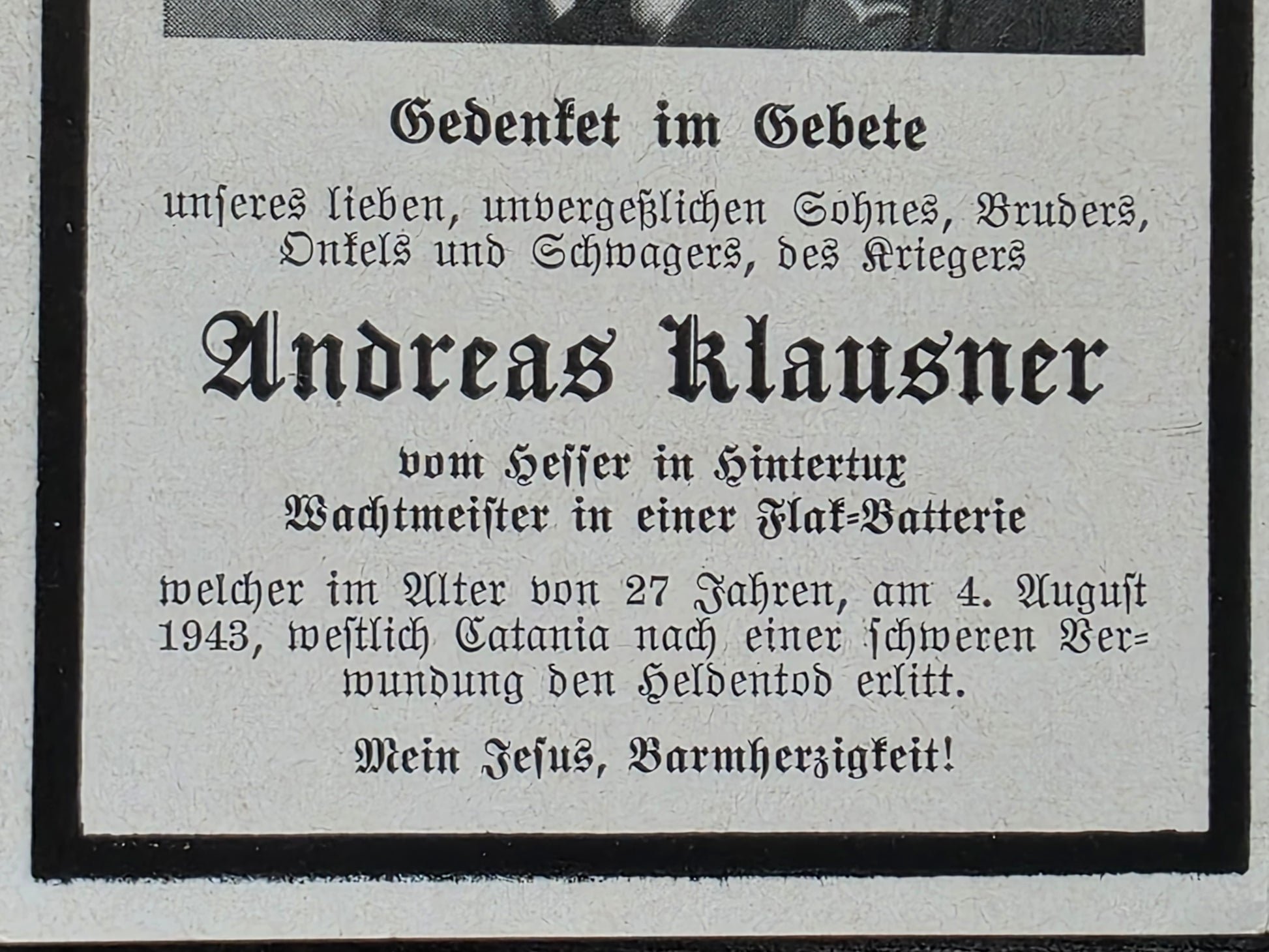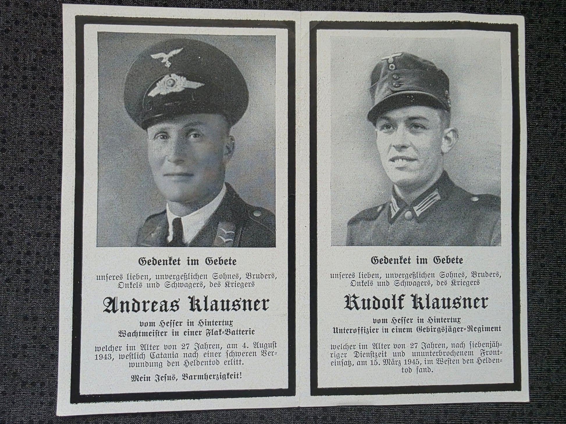 Sterbebild Brüder Tux Wachtmeister Flak Batterie Catania Italien Unteroffizier Gebirgsjäger Endkampf Niederzerf Kastel