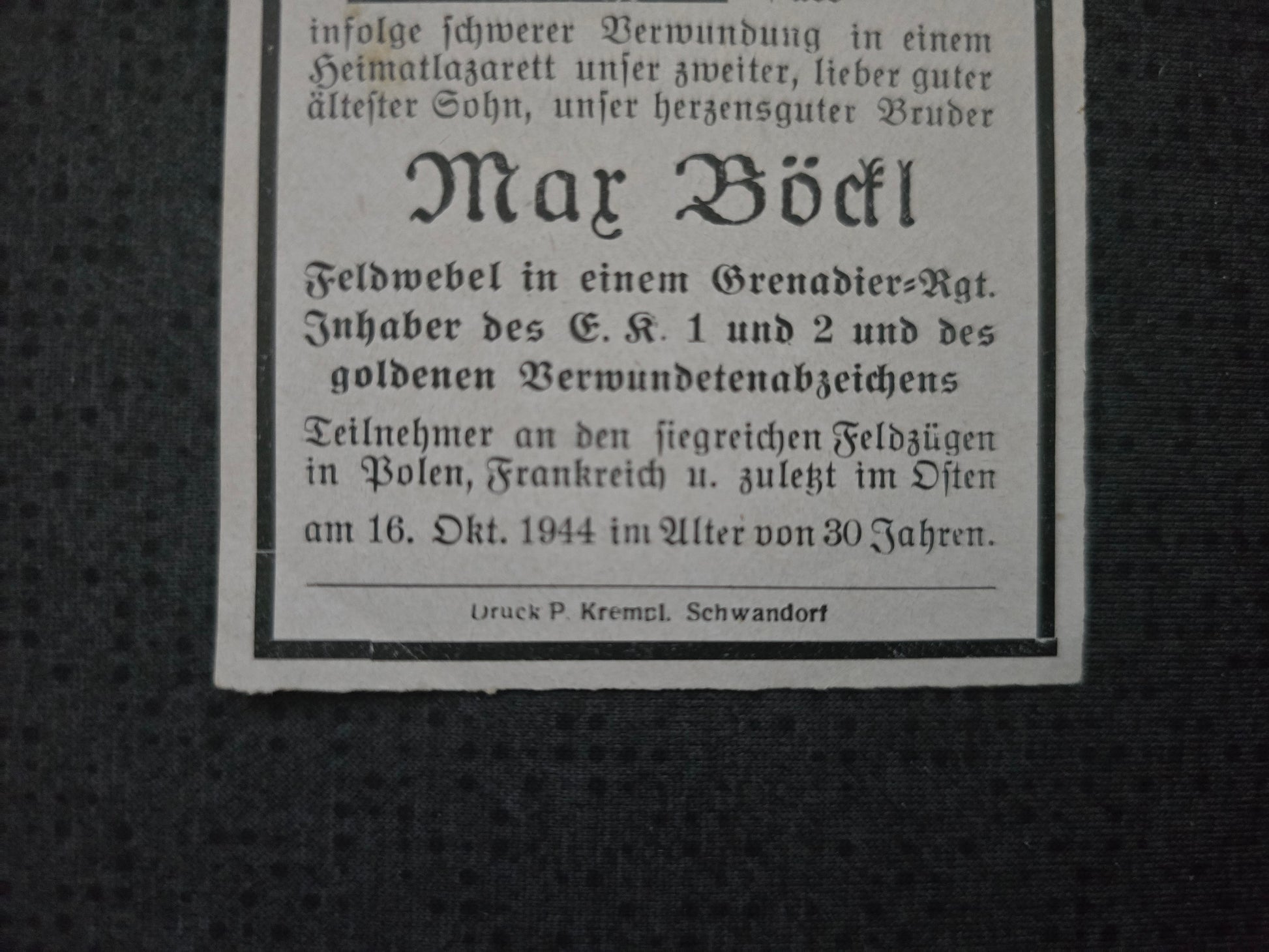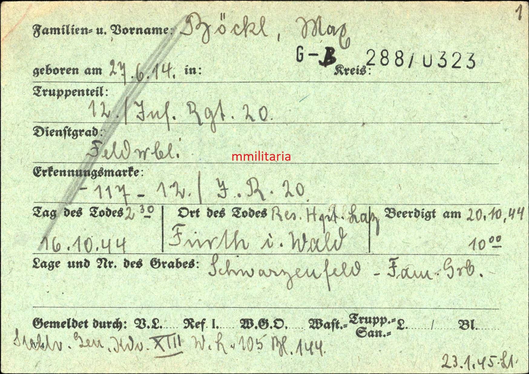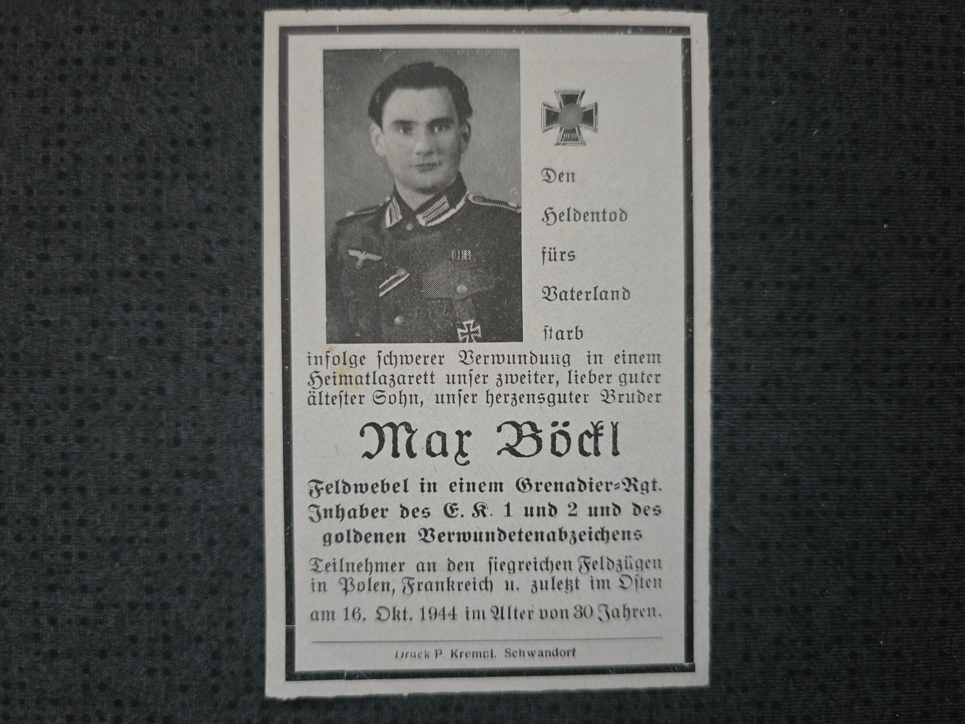 Sterbebild Feldwebel 12. Inf. Regt. 20 EK I & II Lazarett Furth im Wald