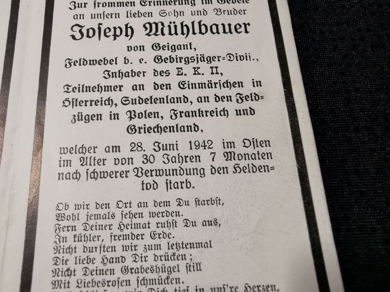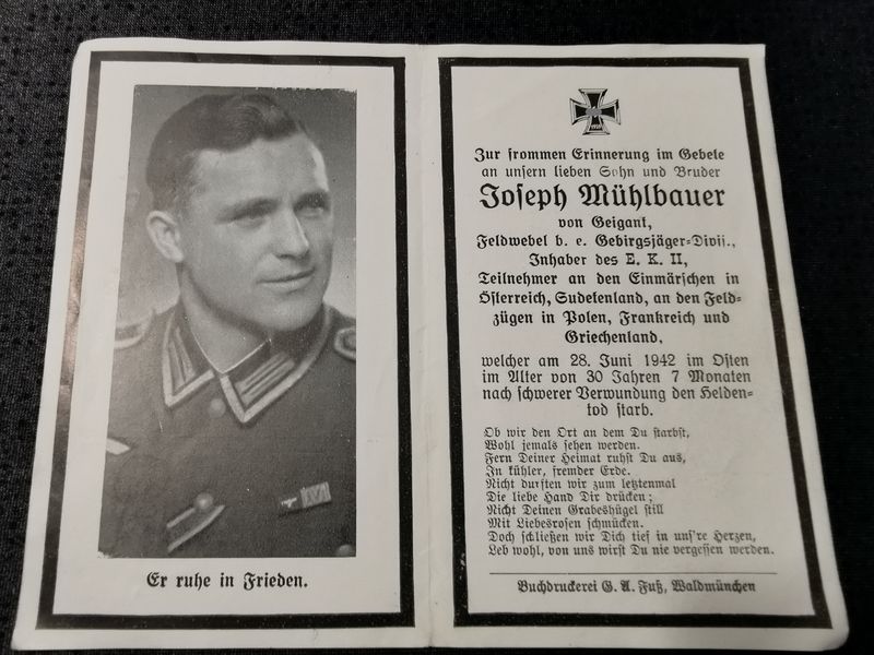 Sterbebild Feldwebel 6. Geb. Jäger Regt. 85 Einmarsch Österreich & Sudetenland EK II Fedorowskoje Russland