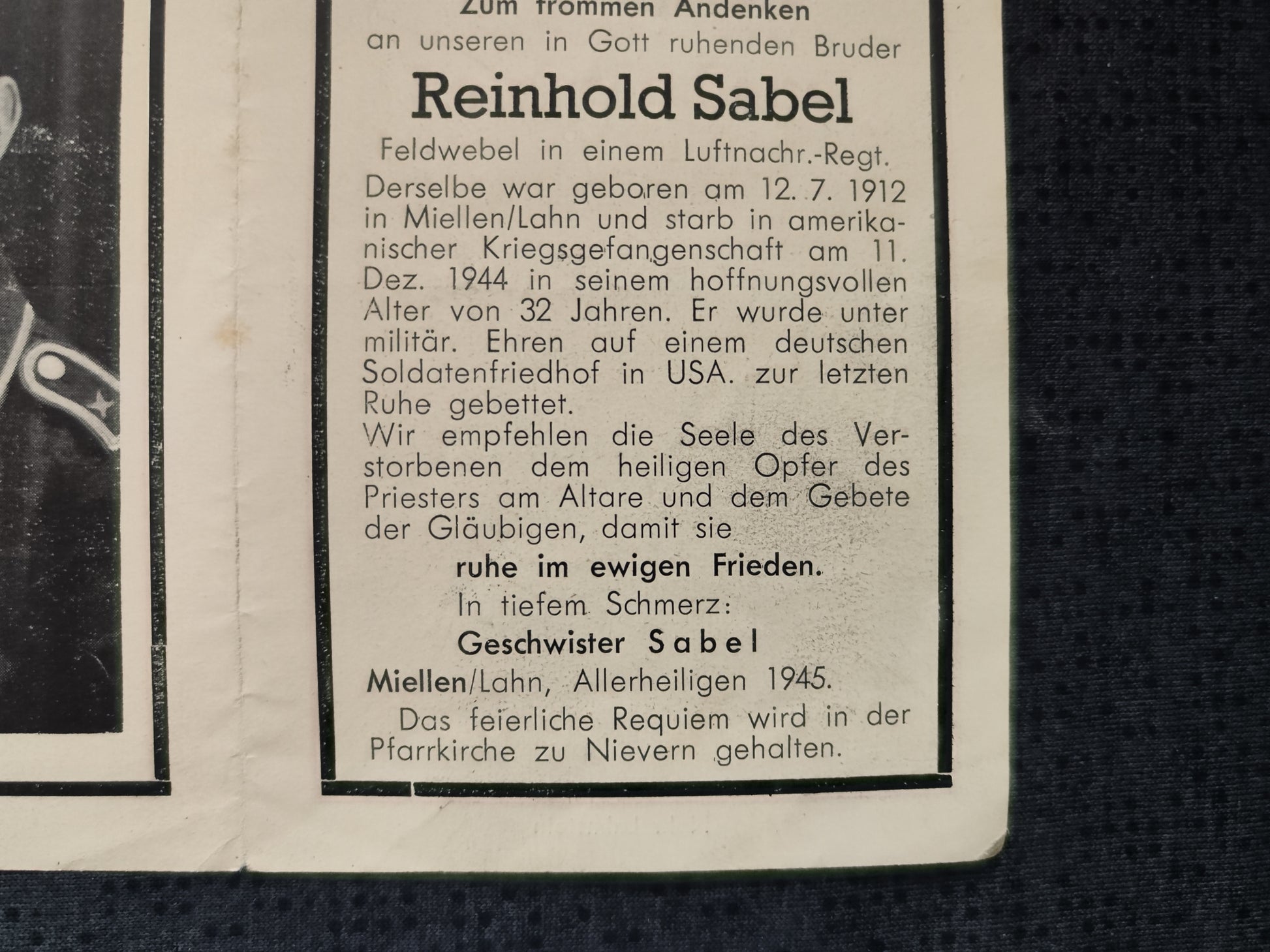 Sterbebild Feldwebel Miellen Luftnachrichten Regt. Chattanooga USA