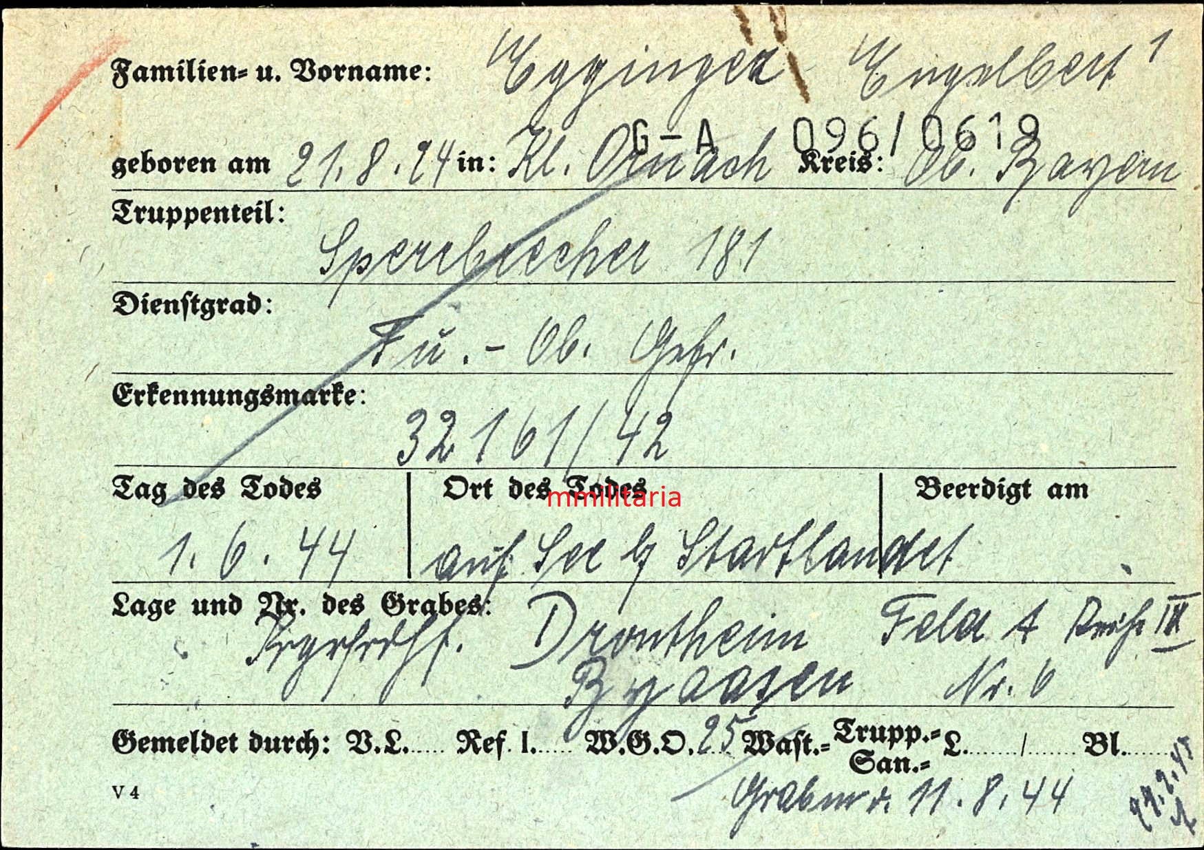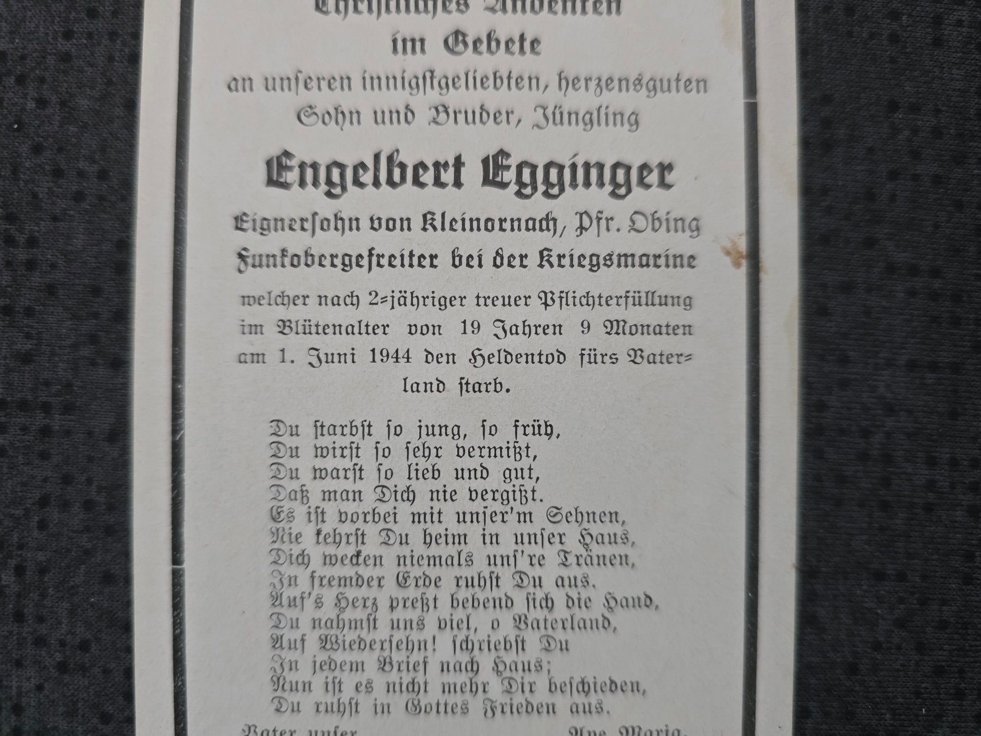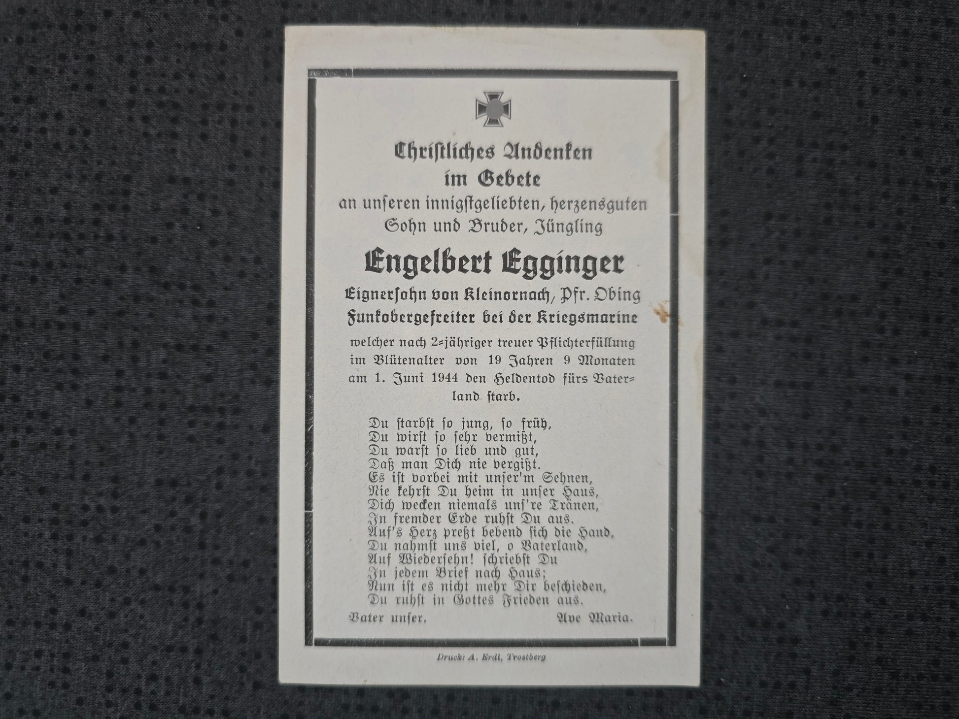 Sterbebild Funk-Obergefreiter Obing Sperrbrecher 181 Stadlandet Vestkapp Trondheim Norwegen