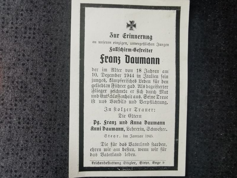 Sterbebild Gefreiter Steyr 1. Komp. Fallschirmjäger Regt. 4 18 Jahre Poggio Futa-Pass Italien
