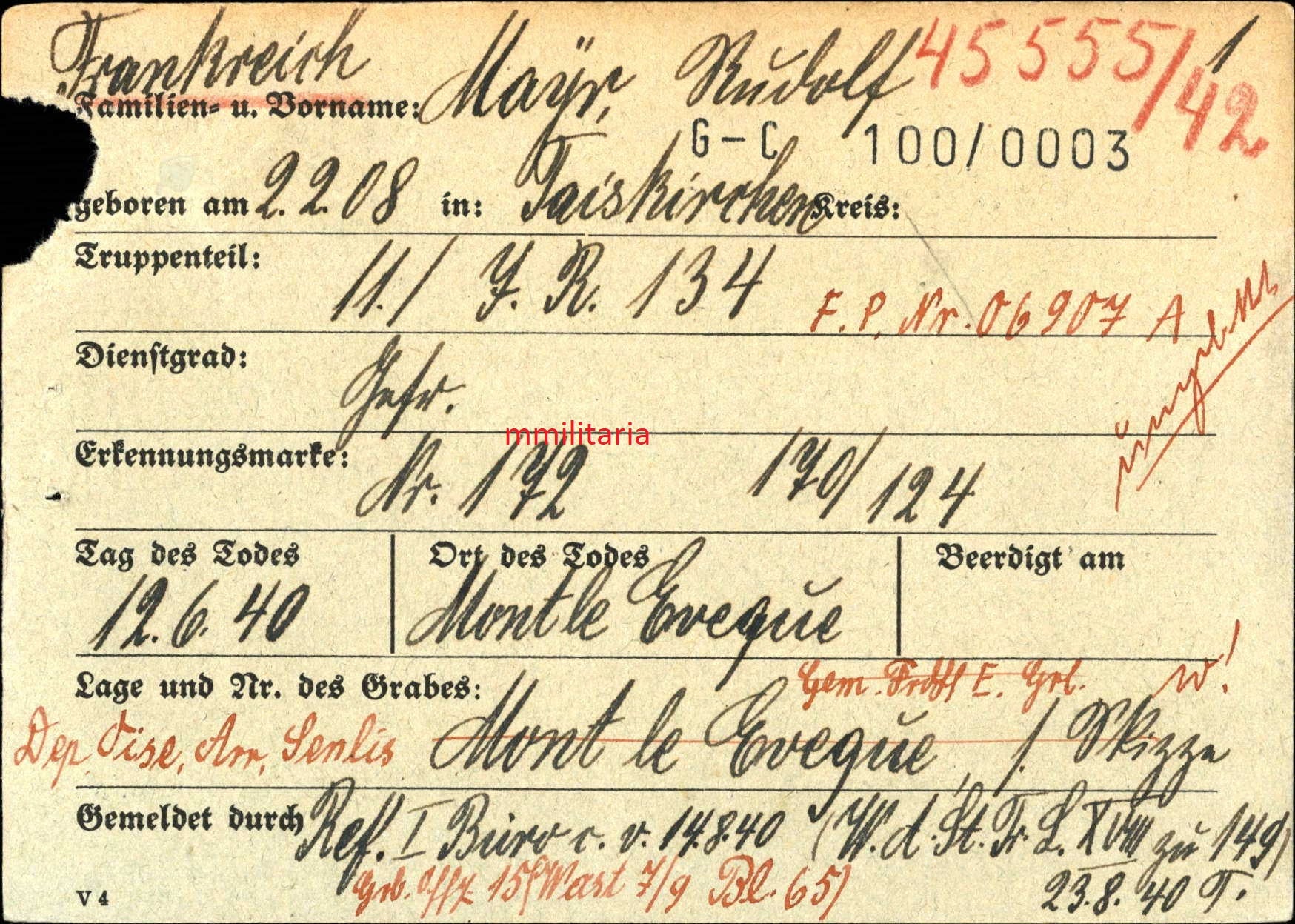 Gefallen am 12.06.1940 bei Mont l`Eveque (Frankreich)