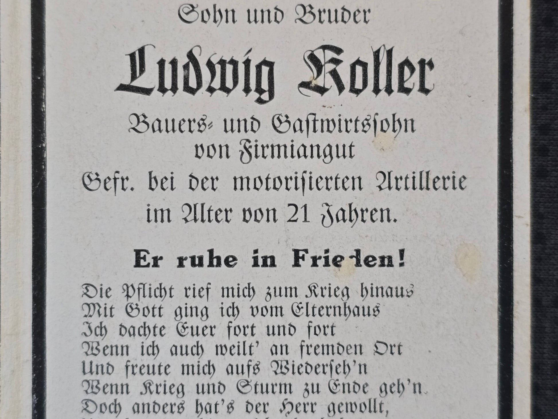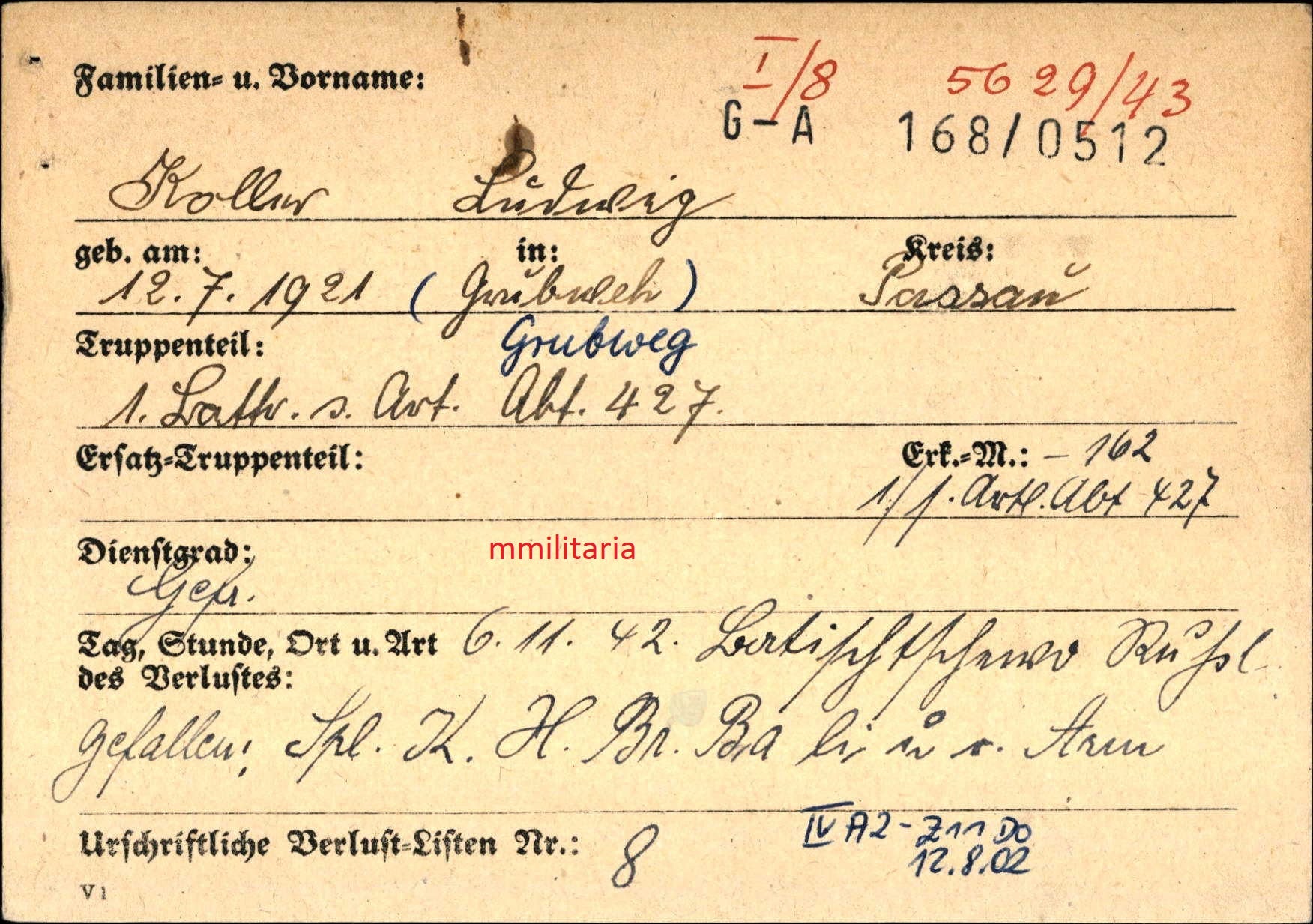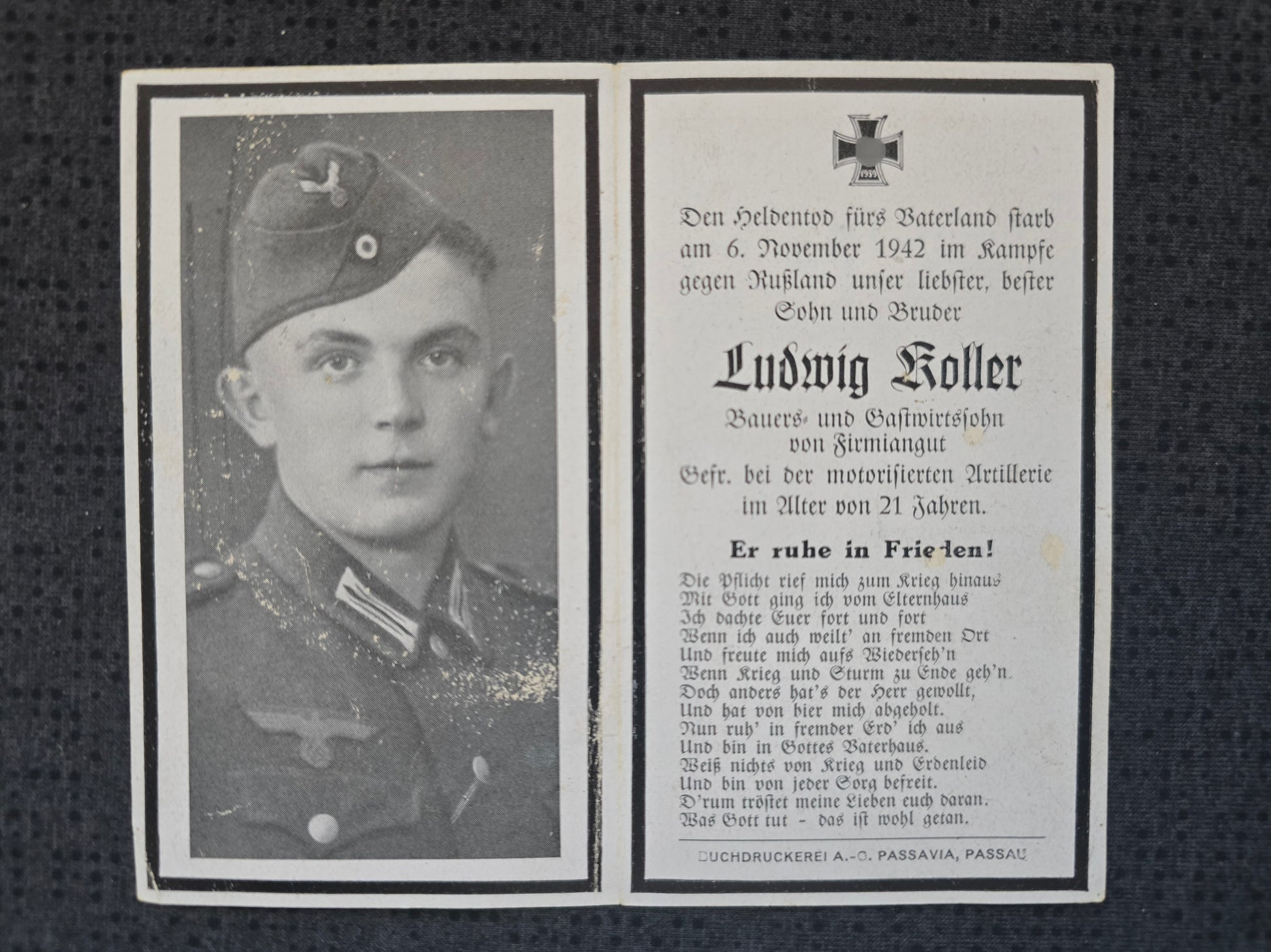 Sterbebild Gefreiter Grubweg 1. Batterie Schwere Art. Abt. 427 Batischtschewo Russland