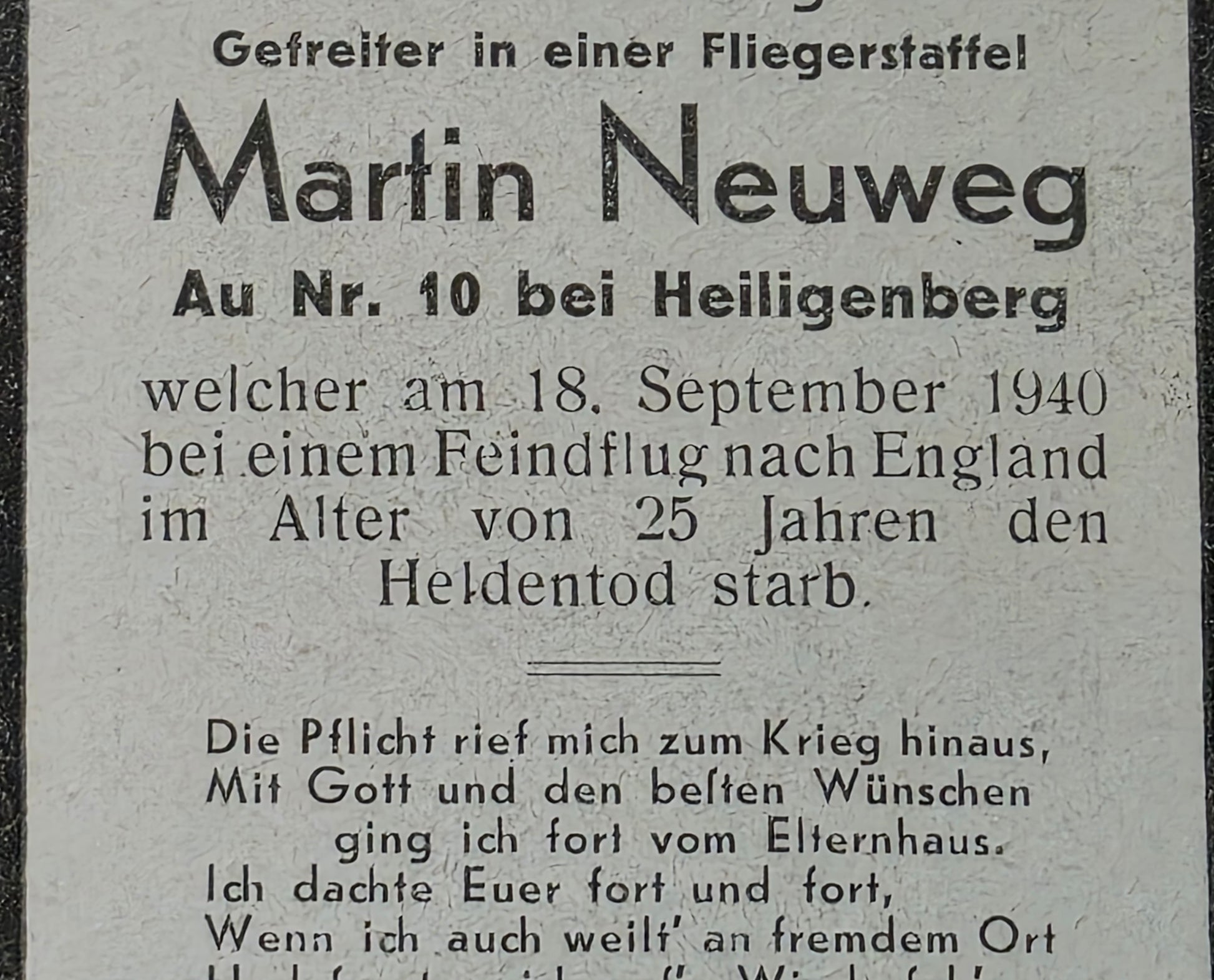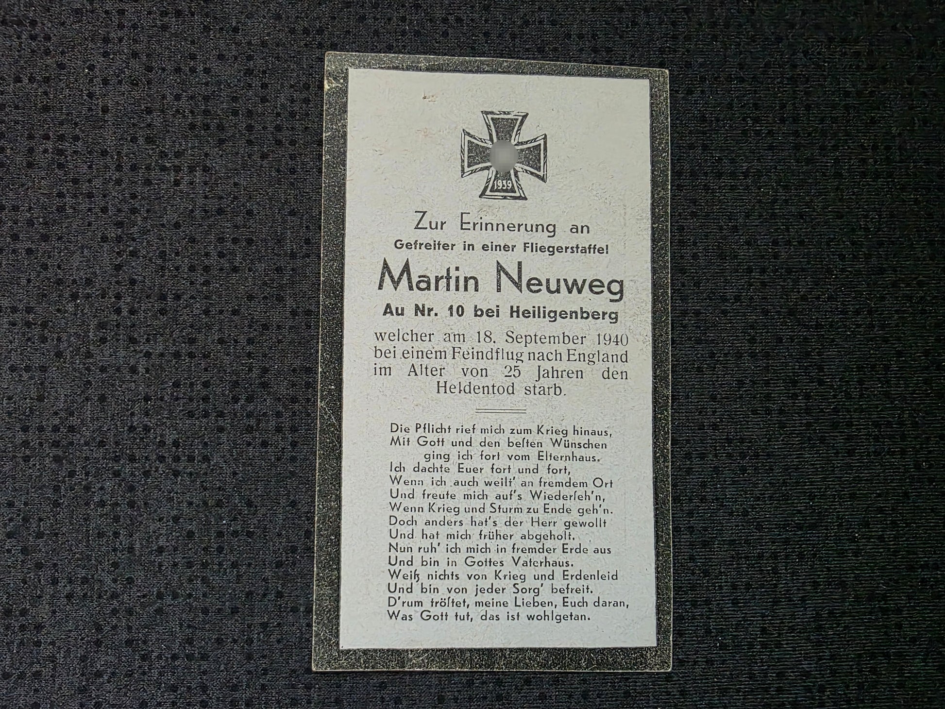 Sterbebild Gefreiter Heiligenberg 8./KG-77 Feindflug England Kanal Dover