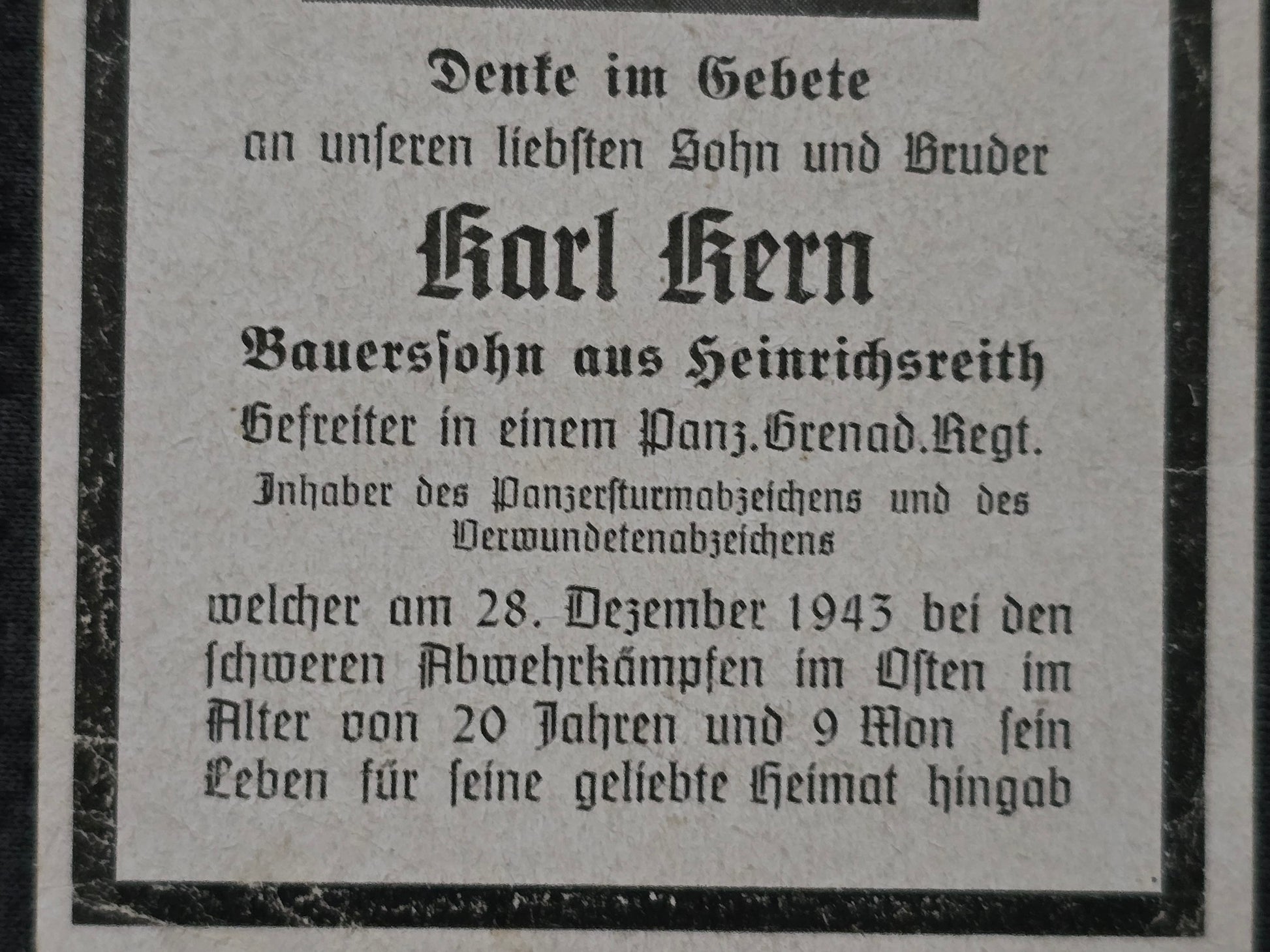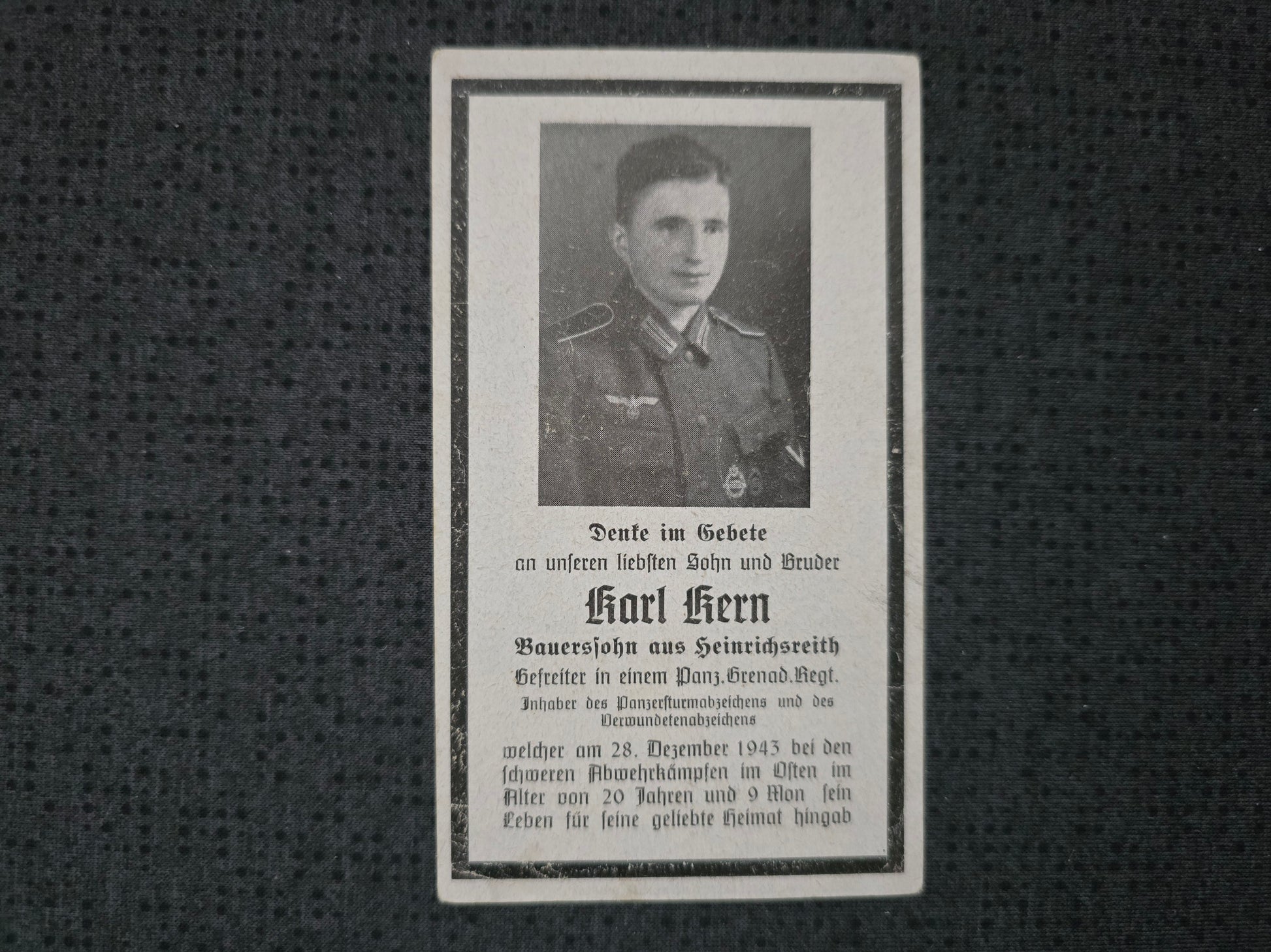 Sterbebild Gefreiter Heinrichsreith Panzer-Grenadier Regt. PSA Osten