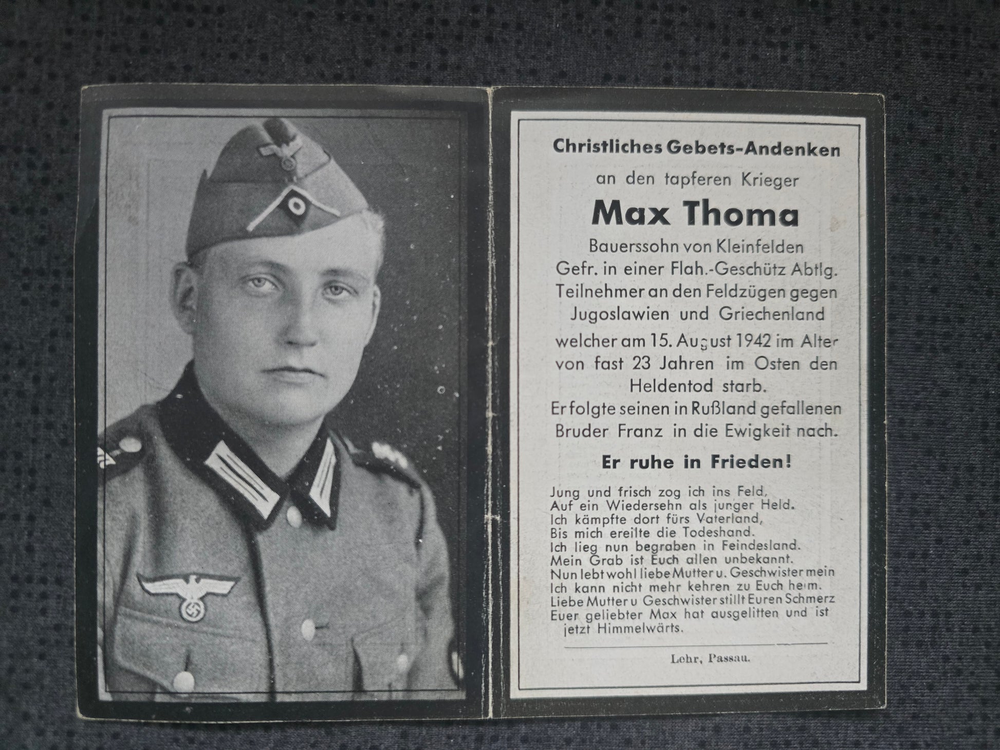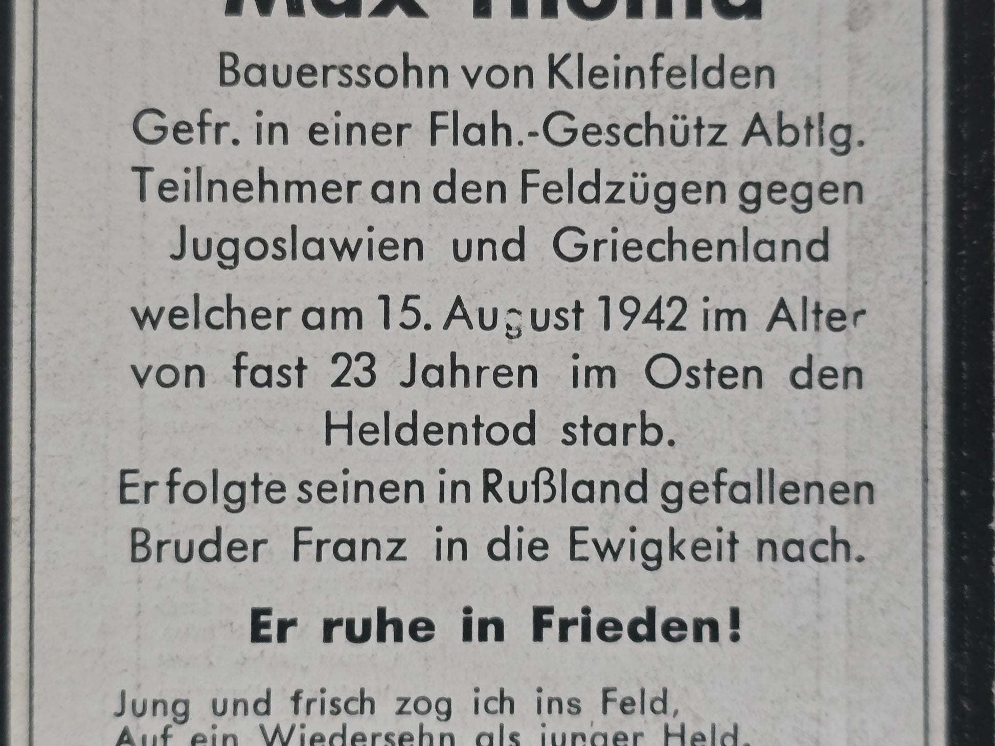 Sterbebild Gefreiter Kleinfelden 2. Komp. Flak Btl. 47 Barsuki Russland