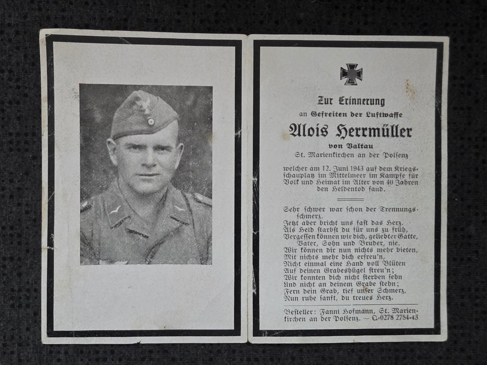 Sterbebild Gefreiter Marienkirchen Luftwaffe Mittelmeer Trapani Sizilien Italien