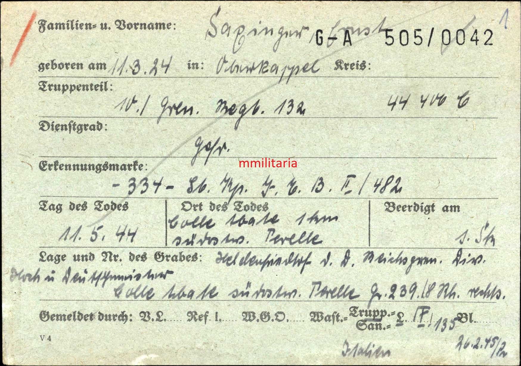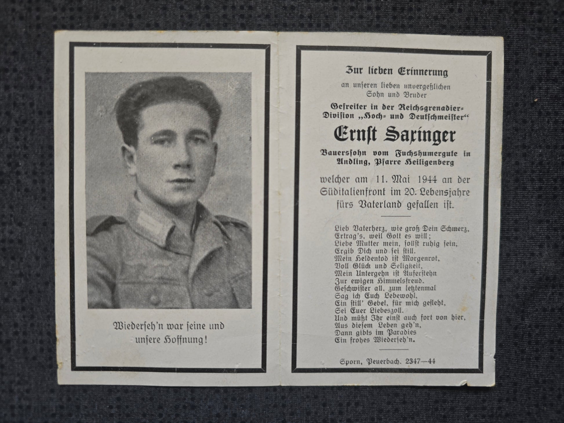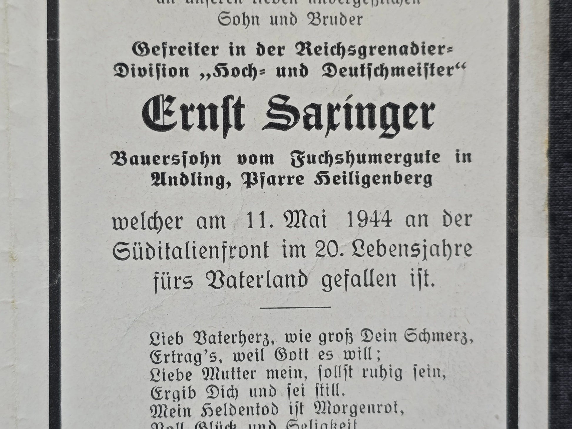 Sterbebild Gefreiter Oberkappel 10. Gren. Regt. 132 "Hoch & Deutschmeister" Terelle Cassino Italien