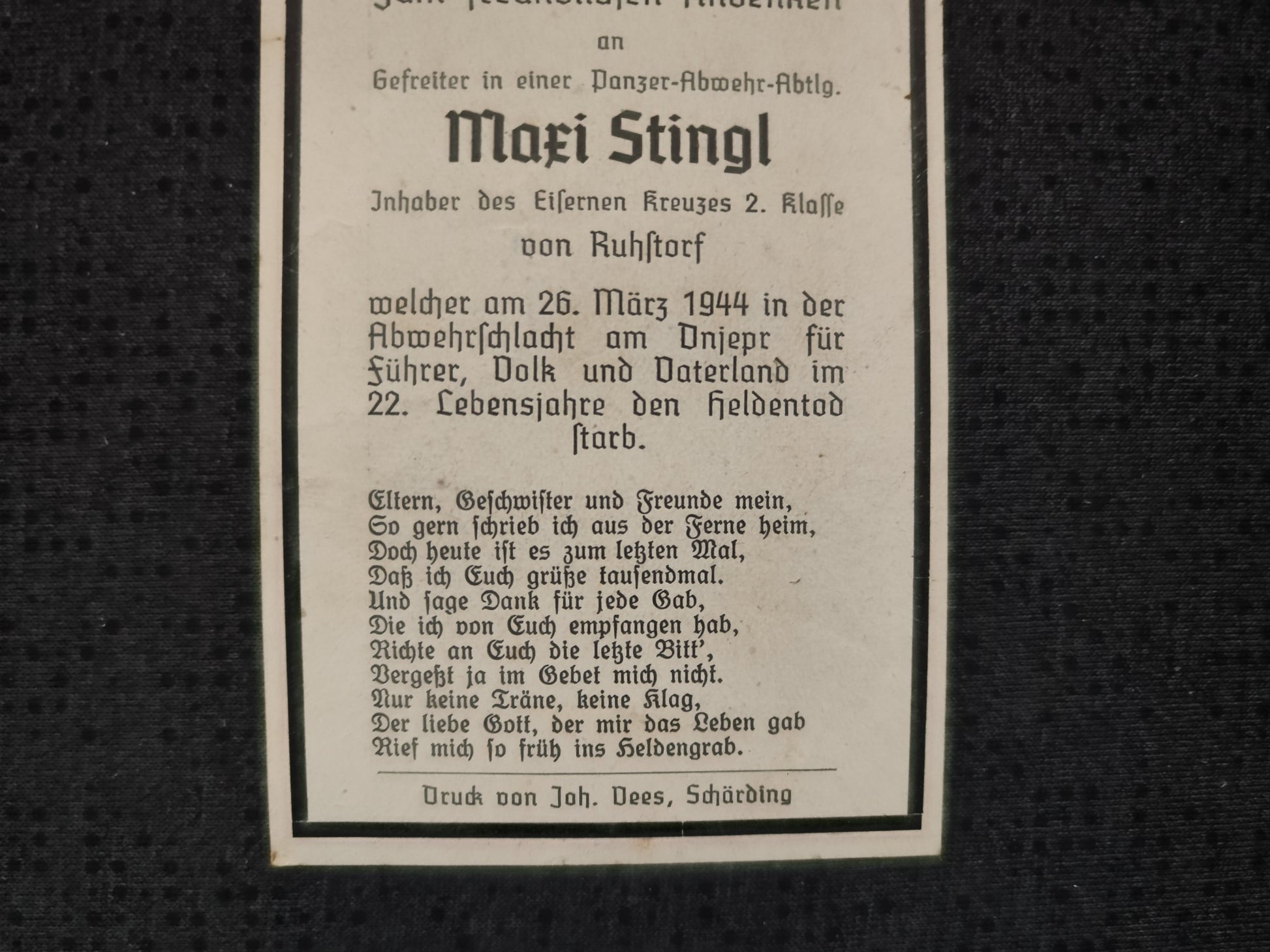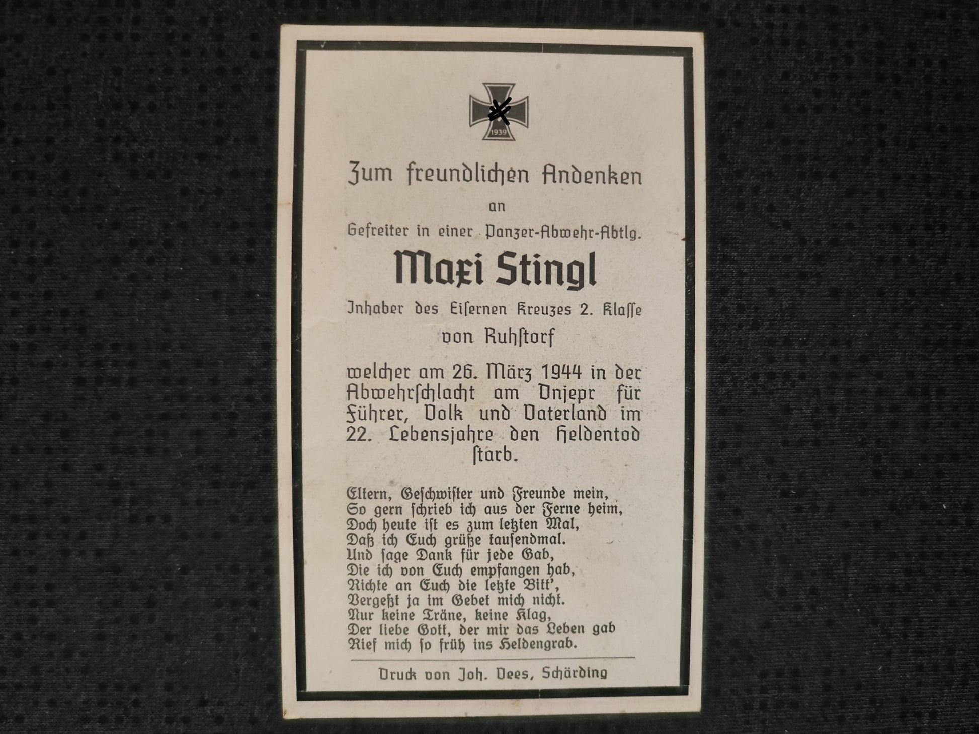 Sterbebild Gefreiter Ruhstorf Panzer Abwehr Abt. 6 Komp. Gren. Regt. 48 Antonowka Ukraine