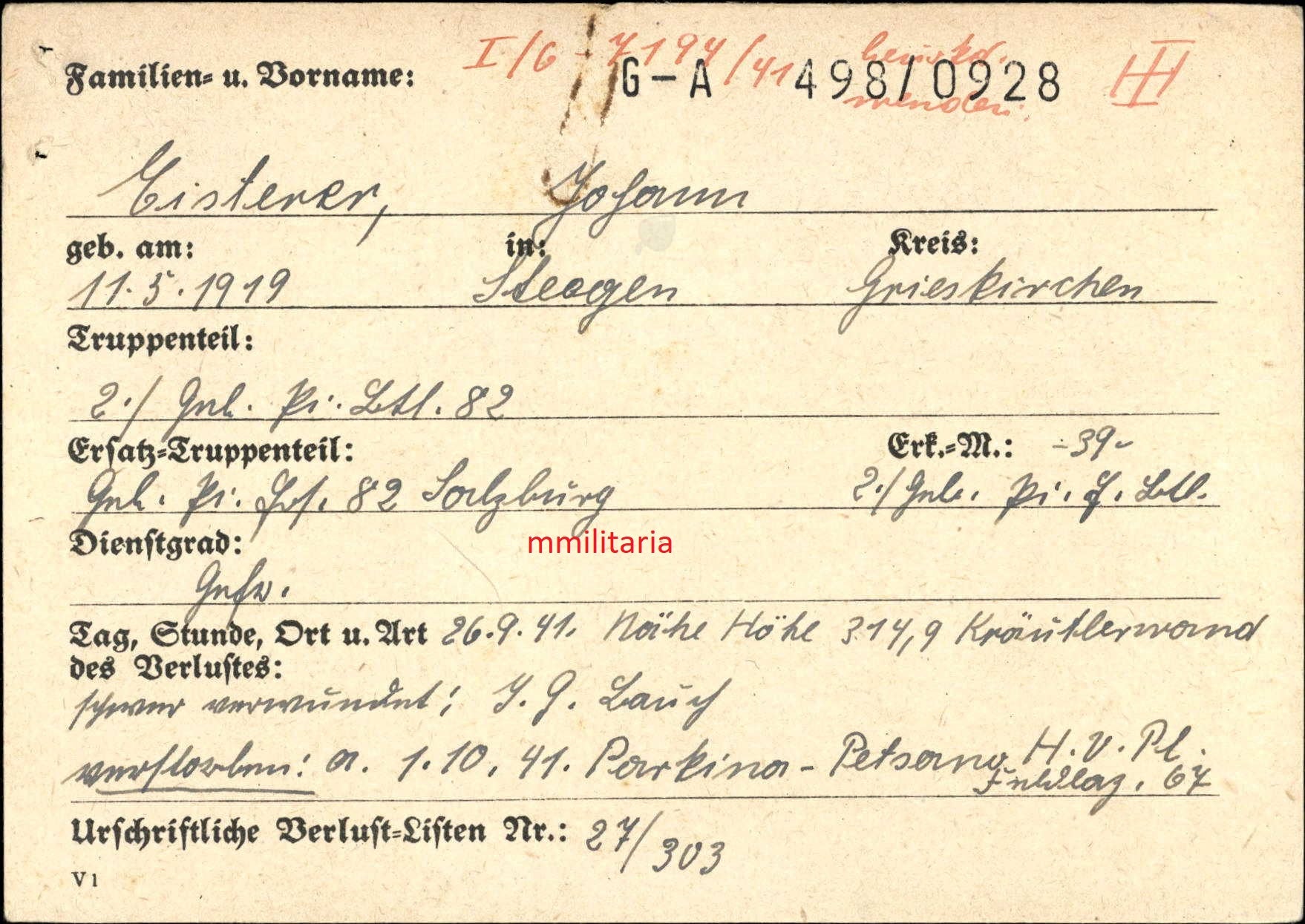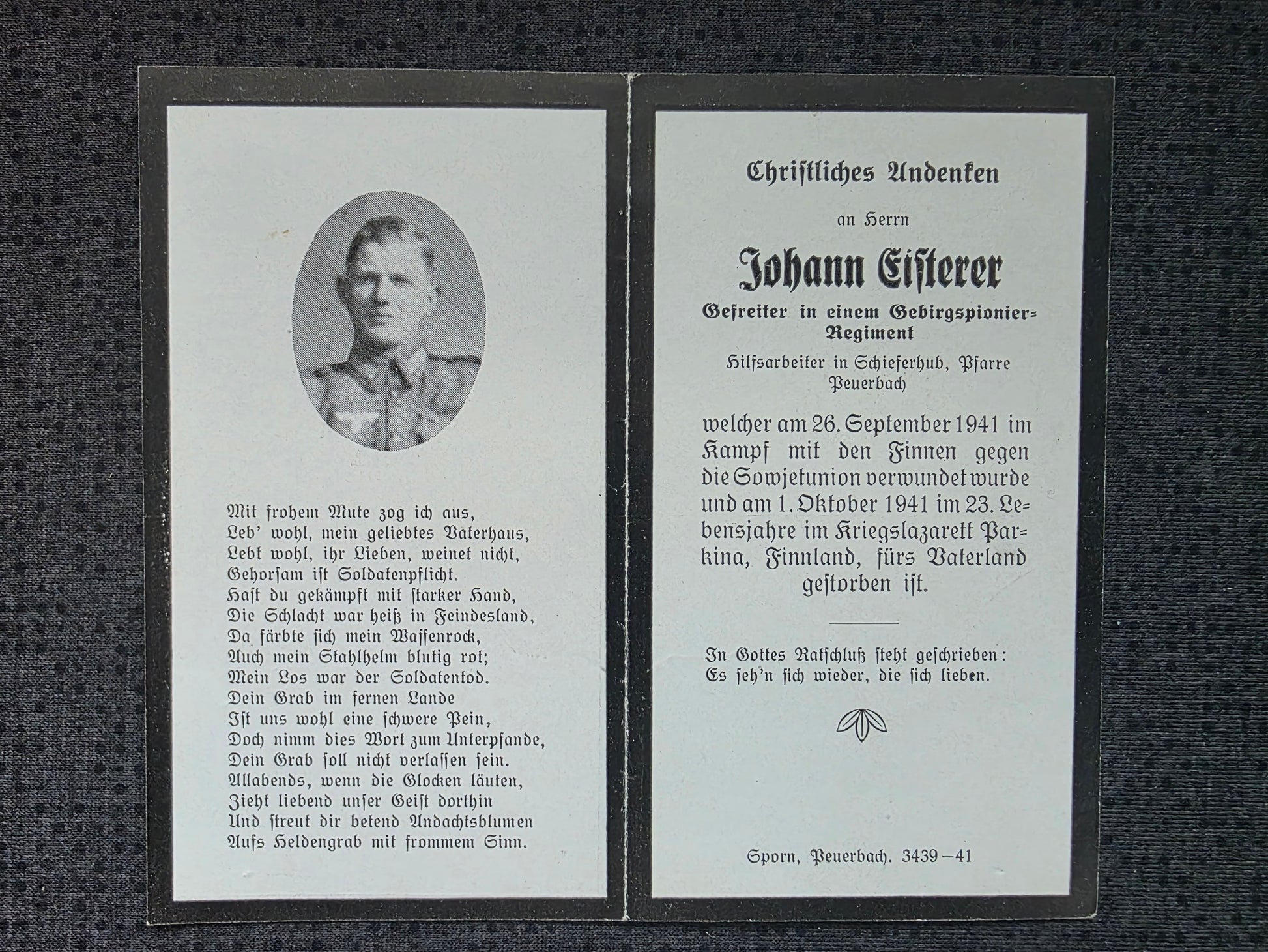 Sterbebild Gefreiter Peuerbach 2. Gebirgs-Pionier Btl. 82 Parkina Kräutlerwand Finnland